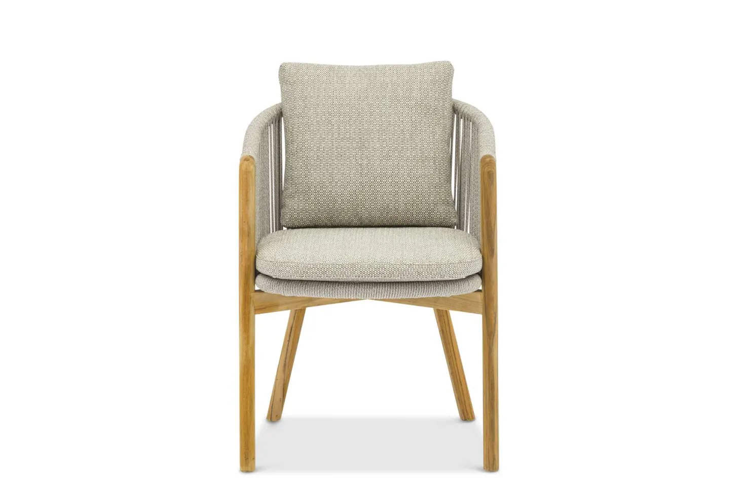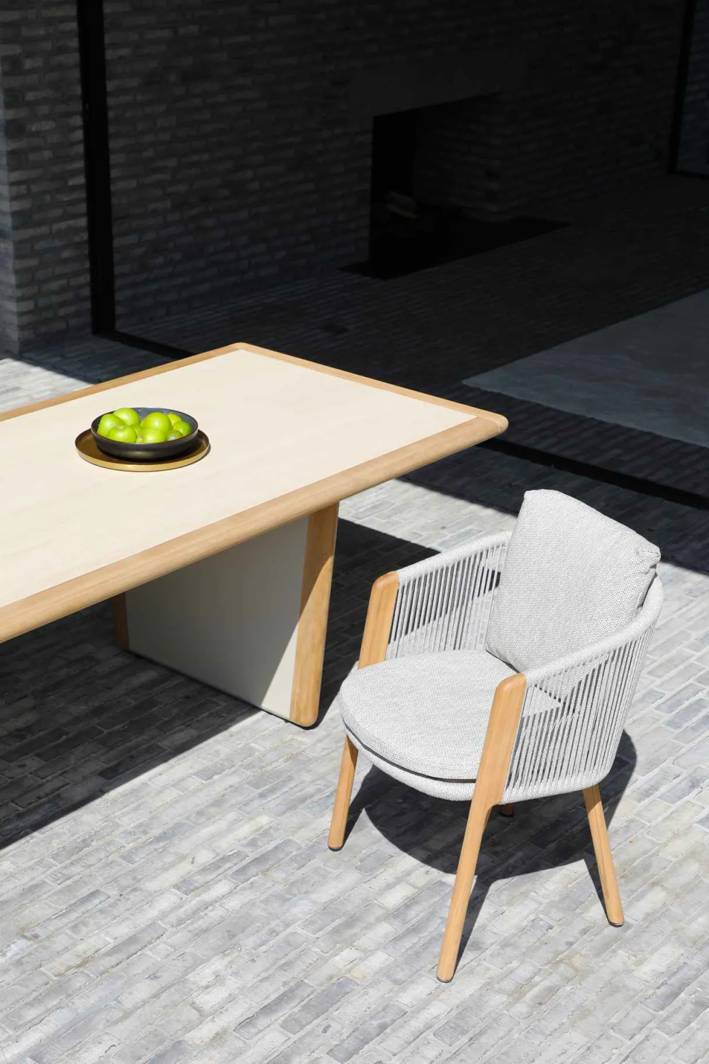 Der stabile Rahmen aus Aluminium verleiht dem Stuhl ein modernes, schlankes Erscheinungsbild und macht ihn gleichzeitig wetterfest und korrosionsbeständig. Für einen natürlichen Akzent sorgen die eleganten Beine aus FSC-zertifiziertem Teakholz, das sich durch seine Langlebigkeit, Widerstandsfähigkeit und warme Ausstrahlung perfekt für den Outdoor-Bereich eignet.