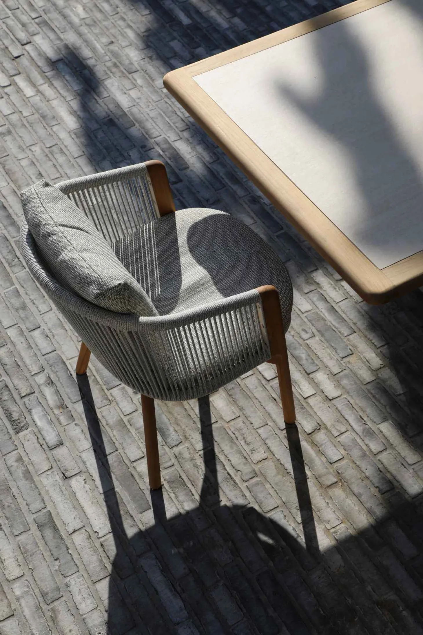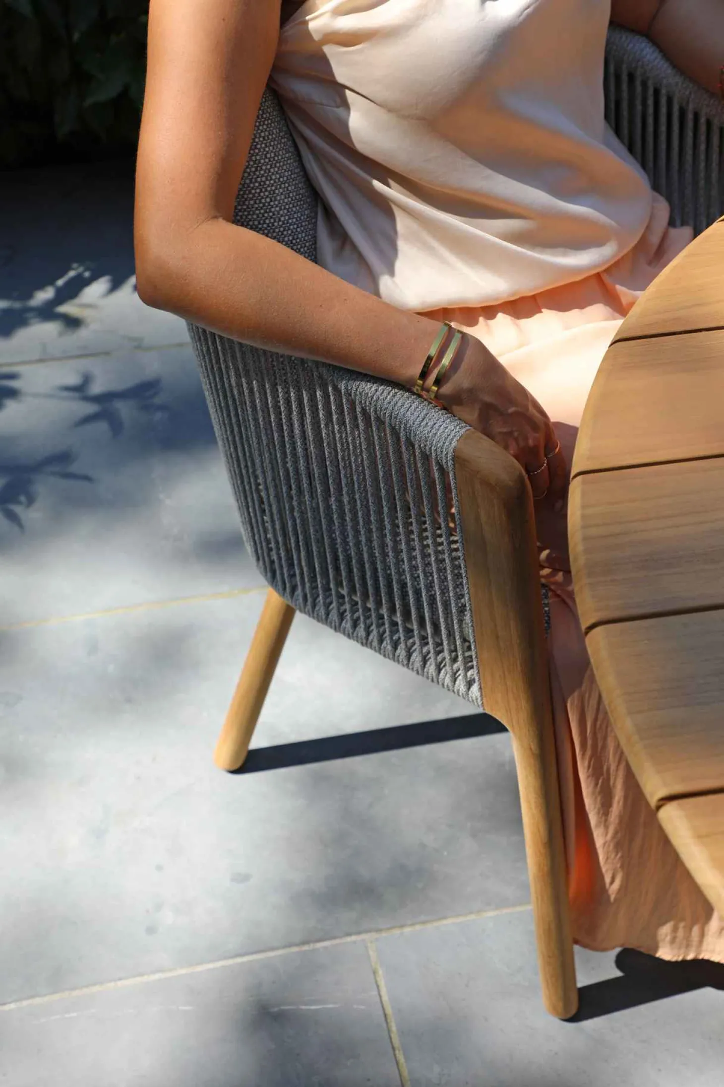 Ein weiteres optisches Highlight ist die sorgfältig gearbeitete Seilbespannung aus Olefin Rope an Rücken- und Seitenflächen. Sie sorgt für eine moderne, luftige Struktur, ist angenehm flexibel und bietet zugleich eine stabile Rückenstütze. Dank ihrer Witterungsbeständigkeit eignet sie sich ideal für den dauerhaften Einsatz im Freien.
