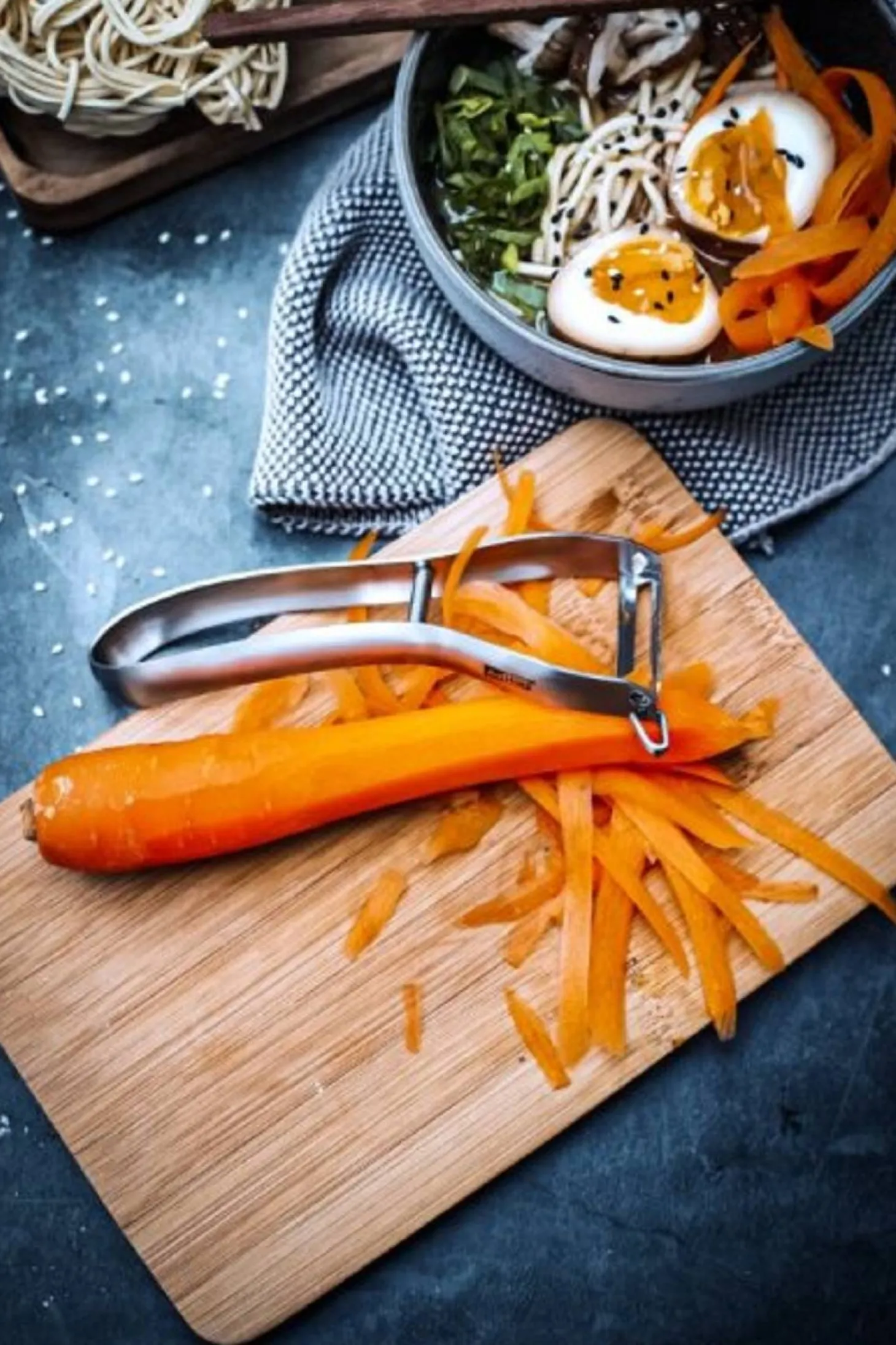 Der Universalschäler Curve von Ad Hoc verbindet geschickt modernes Design mit kompromissloser Funktionalität. Die scharfen, wechselbaren Präzisionsklingen aus japanischem Messerstahl eignen sich hervorragend zum Schälen von sämtlichem Gemüse. Ergänzend hierzu bietet der Universalschäler aus Edelstahl auch noch einen geschärften Ausstecher an der Ecke. Dank ergonomischem Design lässt sich mit dem Universalschäler Curve ermüdungsfrei arbeiten, sowohl bei großen als auch bei kleinen Händen. Curve ist außerdem Spülmaschinengeeignet.