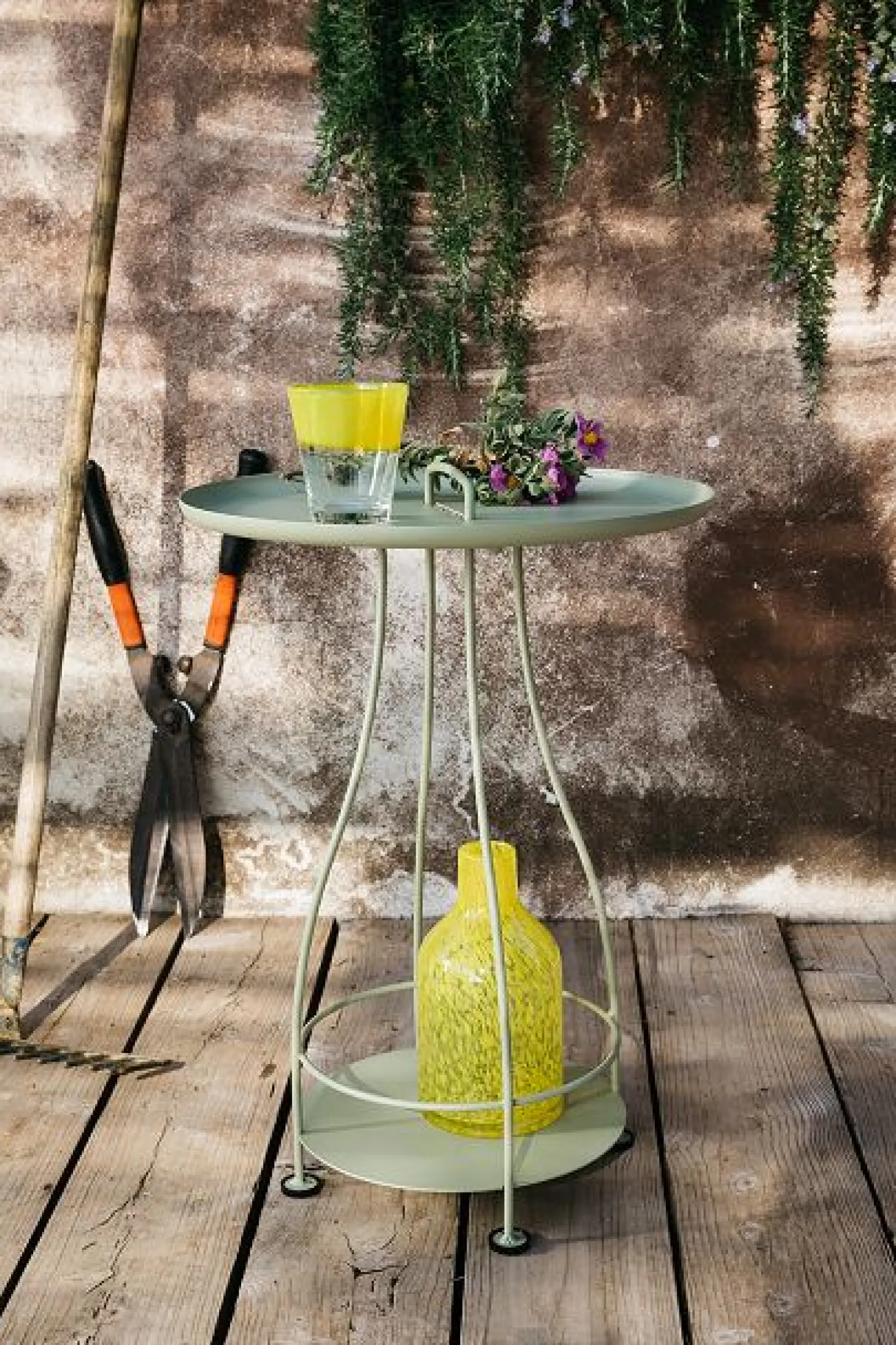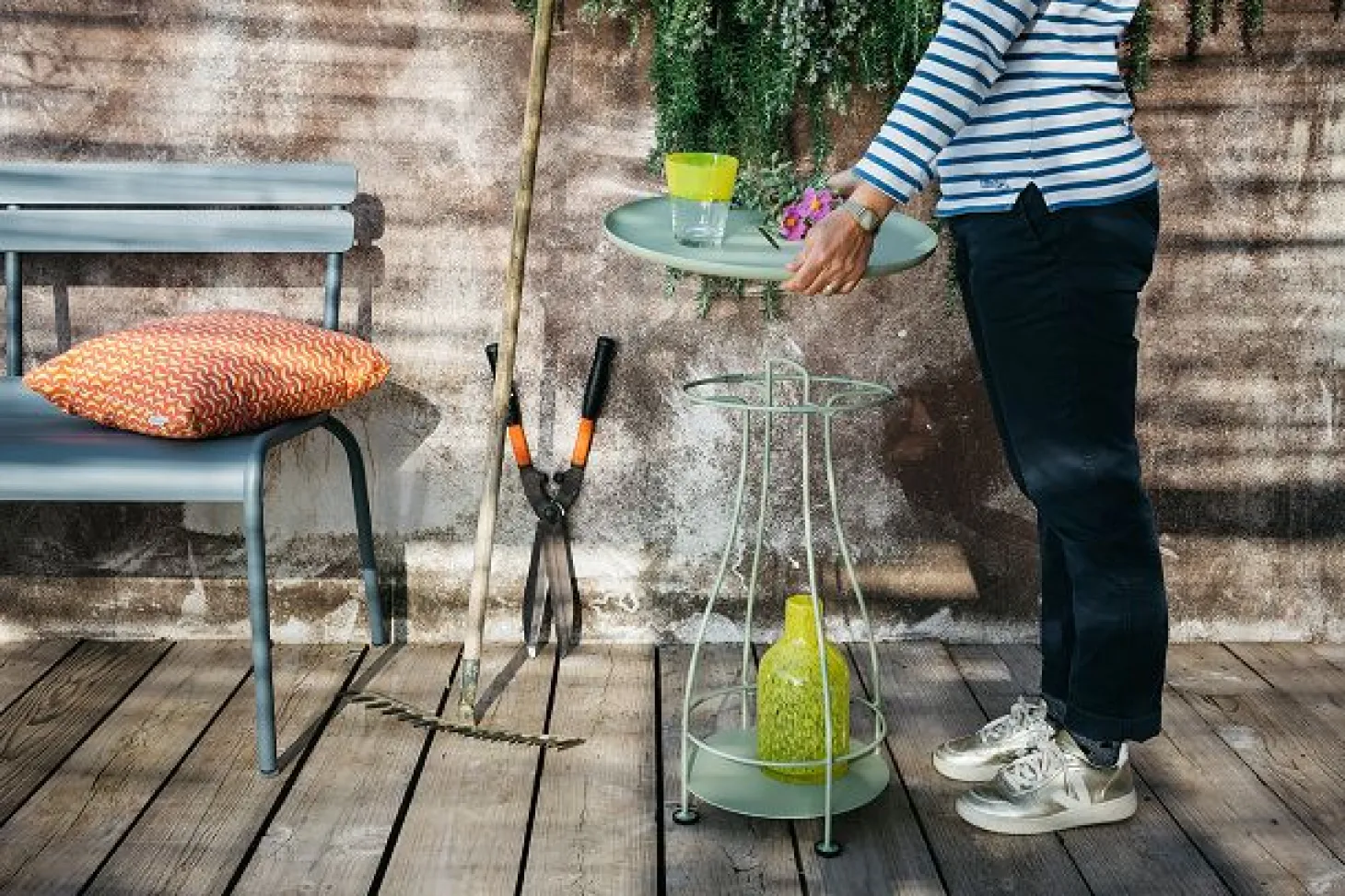 Der Happy Hours Beistelltisch von Fermob ist im Sommer Ihr stetiger Begleiter. Dank seiner leichten Bauart (grade einmal 3,2 kg schwer) und dem handlichen Henkel lässt der Outdoor Beistelltisch sich ganz einfach überall hin mitnehmen. Die Tischplatte ist außerdem abnehmbar und dient Ihnen als Tablett. So steht einem entspannten Beisammensein mit der Familie oder auch dem täglichen Sonnenbaden nichts mehr im Wege. Im unteren Bereich des Beistelltisches findet sich eine weitere Ablagemöglichkeit, diese ist mit einem Ring gesichert. Dort können beispielsweise Flaschen abgestellt werden. Auch kann der Happy Hours Beistelltisch dank der vielfältigen Individualisierungsmöglichkeiten genau auf Ihren Betrieb zugeschnitten werden. So kann beispielsweise das Logo Ihres Restaurants per Siebdruck oder Laserschnitt in Ihrem Stuhl integriert werden. Bei Interesse sprechen Sie uns einfach an.