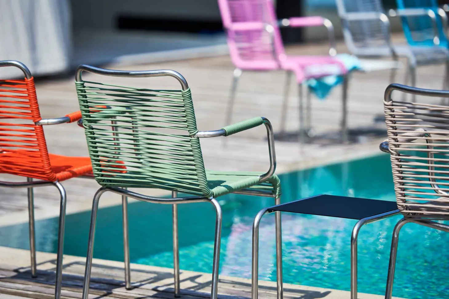 Der MYA Spaghetti lässt sich stapeln, was ihn zur idealen Lösung für kleinere Balkone, Terrassen oder auch für die Gastronomie macht. So sparen Sie Platz, wenn der Sessel gerade nicht gebraucht wird.