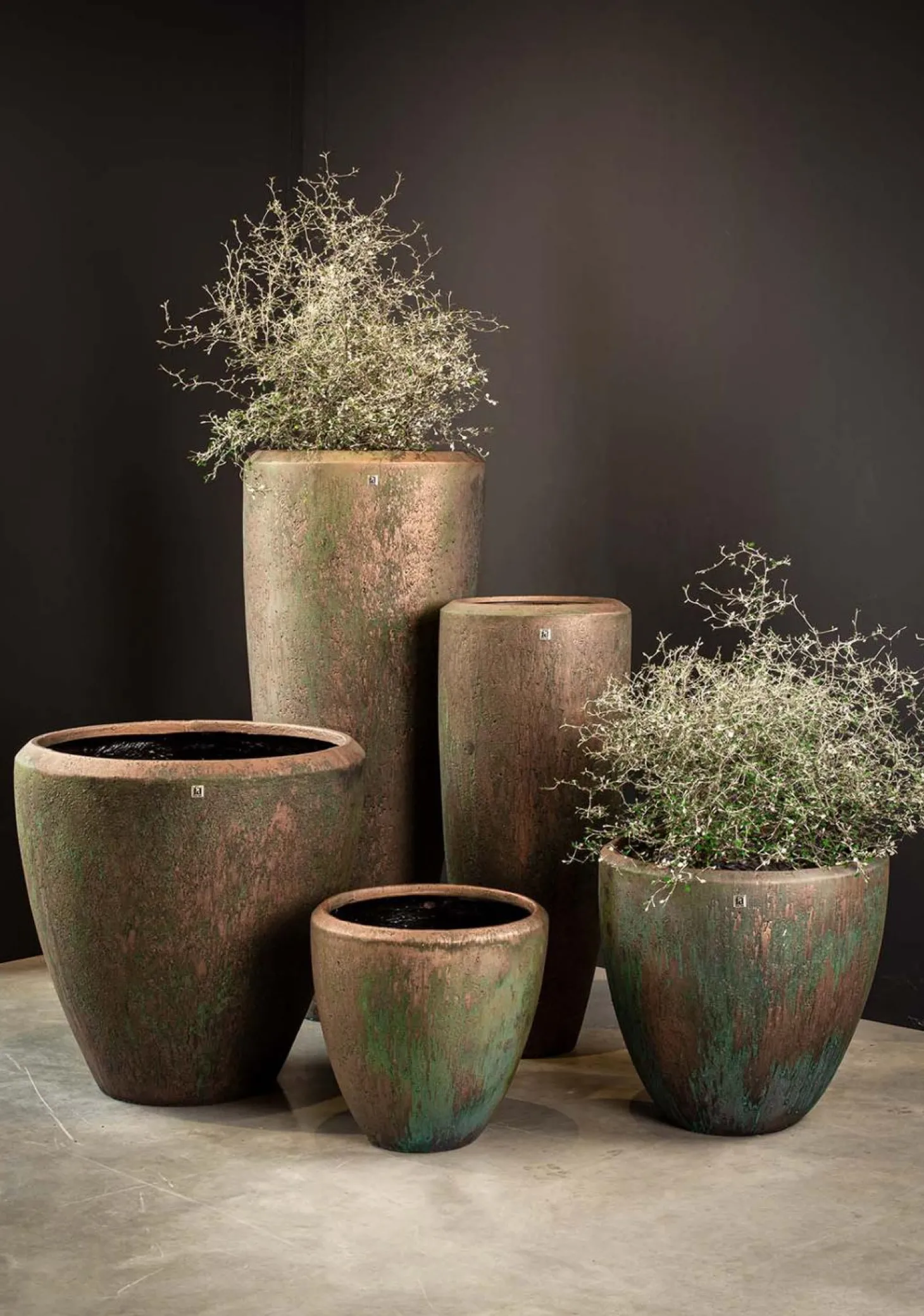 Die ATLANTIS Serie von fleur ami präsentiert eine exklusive Kollektion handgefertigter Pflanzgefäße mit einem bemerkenswerten Design und einem außergewöhnlichen Bronze-Look. Hergestellt in Europa aus leichtem, aber dennoch robustem GFK-Werkstoff (glasfaserverstärktem Kunststoff), bieten diese Gefäße eine einzigartige, korrodierte Optik, die an den Kontakt mit Meerwasser erinnert. Die Oberflächenstruktur ist leicht texturiert und durch eine Mischung von Farben und Pigmenten entsteht ein individueller, oxidierter Effekt, der jedes Gefäß zu einem Unikat macht.