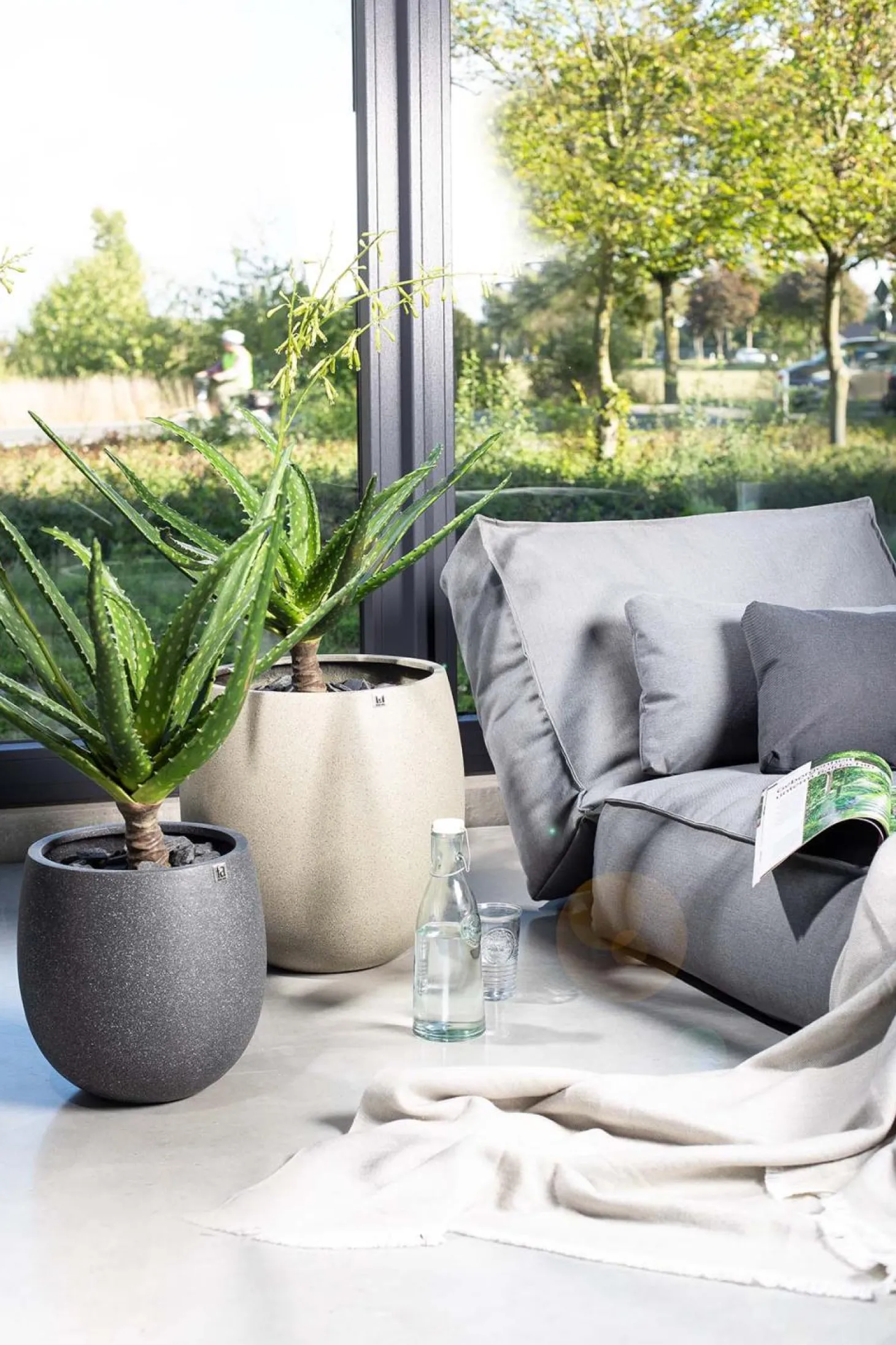 Der runde Pflanzenübertopf CLIFF von fleur ami überzeugt durch seine robuste Bauweise und eine interessante Graphit-Oberfläche. Dieses mittelgroße Pflanzgefäß ist in drei verschiedenen Größen erhältlich und passt sich dank seines schlichten, modernen Designs jedem Gartenstil an.