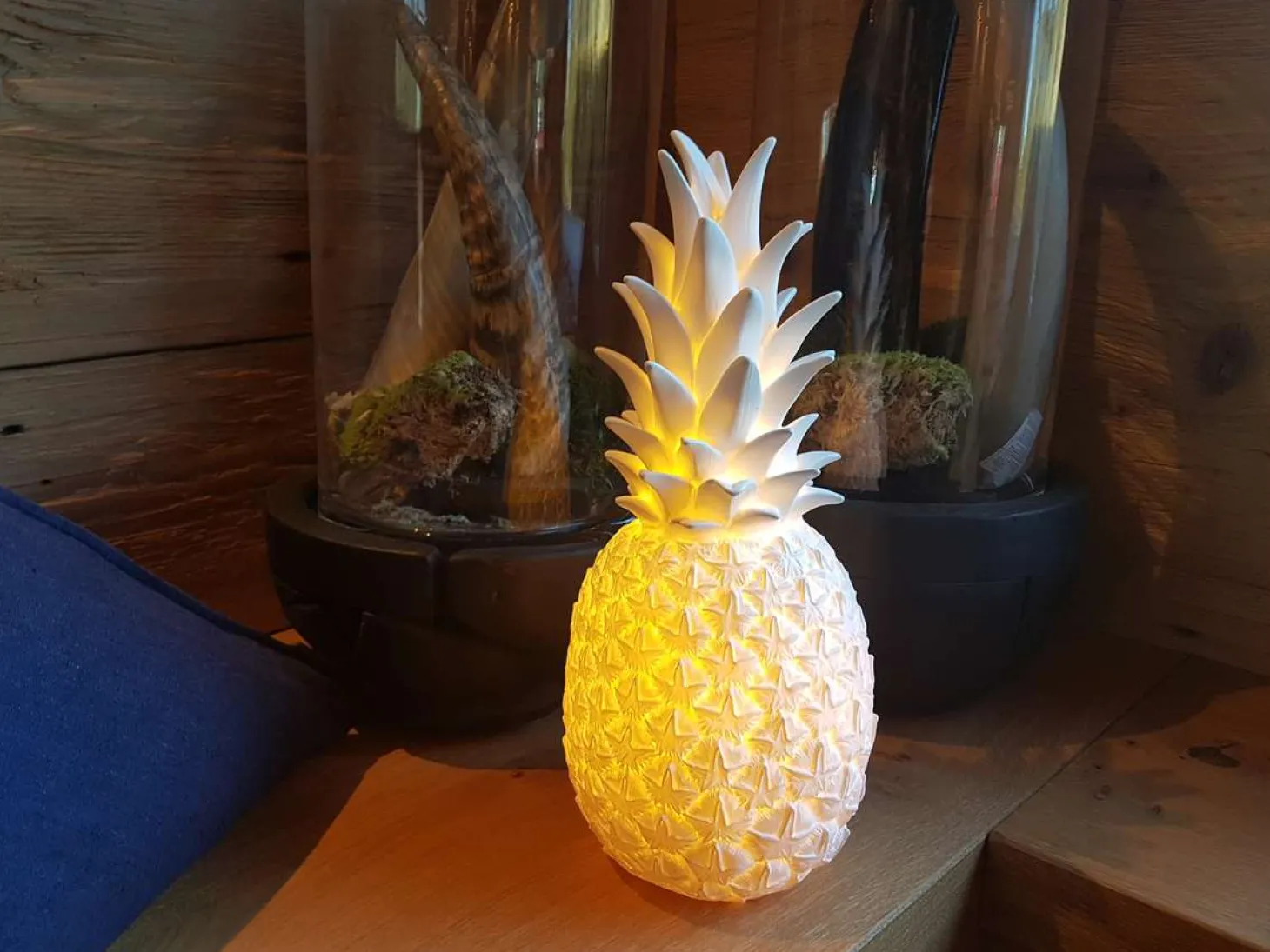 Dekorieren Sie Ihren Gartentisch mit der Dekoleuchte Ananas „The Pinacolada Lamp“ gelb von GOODNIGHT Light® . Die detailreiche und filigrane Verarbeitung lassen die Form der Ananas realistisch erscheinen. Die Tischleuchte in Ananas-Form wurde in einer Spezialmanufaktur in Spanien gefertigt. Das weiße LED Licht lässt die safranfarbene Ananas bis hoch in die Blätter leuchten. Wählen Sie aus einer von 6 einstellbaren Farben oder einem sanften Farbwechsel das Licht passend zu der Stimmung am Abend. Für eine besonders romantische Stimmung wählen Sie einfach den Kerzenscheinmodus der Designerleuchte. Bitte beachten Sie, dass durch den farbigen Leuchtkörper nicht alle Farben im Originalton wiedergegeben werden können. Die Leuchte ist spritzwassergeschützt und kann somit auch Outdoor genutzt werden. Sie sollte jedoch nicht im strömenden Regen oder dauerhaft im Freien stehen.