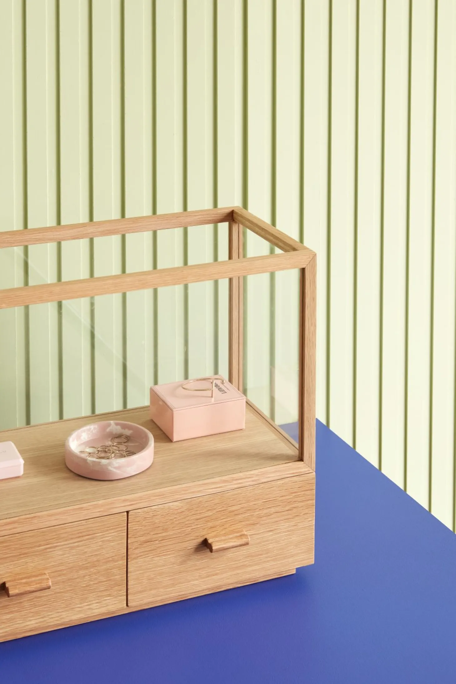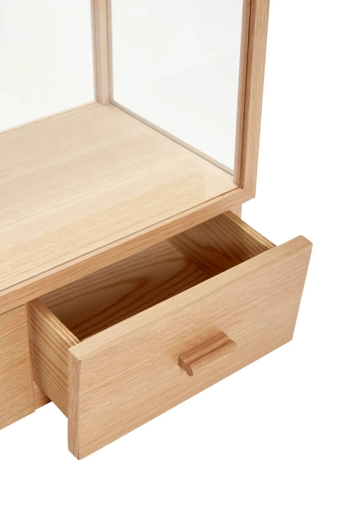 Das klare Glas ermöglicht eine transparente Sicht auf die ausgestellten Objekte, während das natürliche Eichenholz einen warmen und einladenden Charme verleiht. Das schlichte und dennoch elegante Design fügt sich nahtlos in jedes Interieur ein und wird zum Blickfang in jedem Raum.