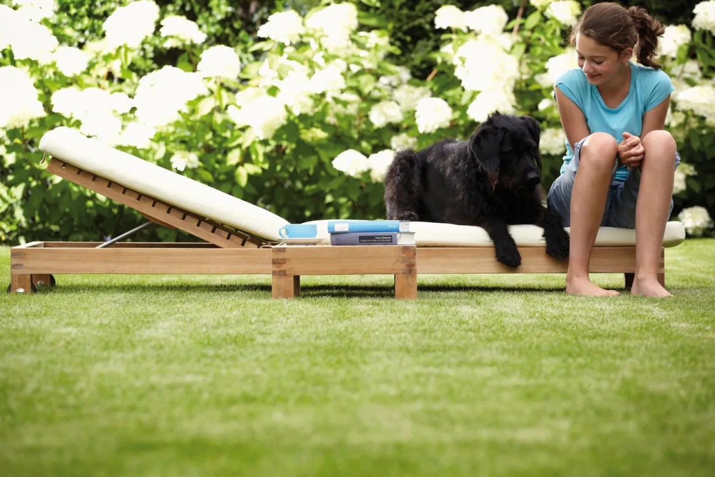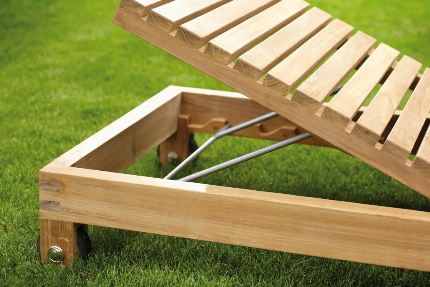 Die Korfu Sonnenliege mit Rollen und 5-fach verstellbarem Kopfteil von Jan Kurtz ist eine moderne und bequeme Liege für Ihren Außenbereich. Das Gestell besteht aus massiven Teakholz und ist somit sehr stabil. Die Liegefläche ist ebenfalls aus Teakholz. Die Farbe der Liege ist in Natur erhältlich.