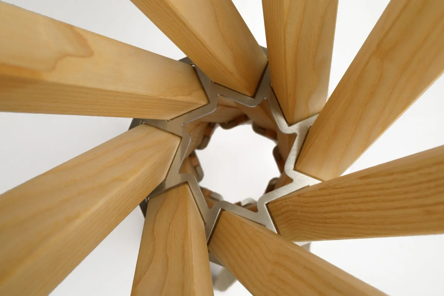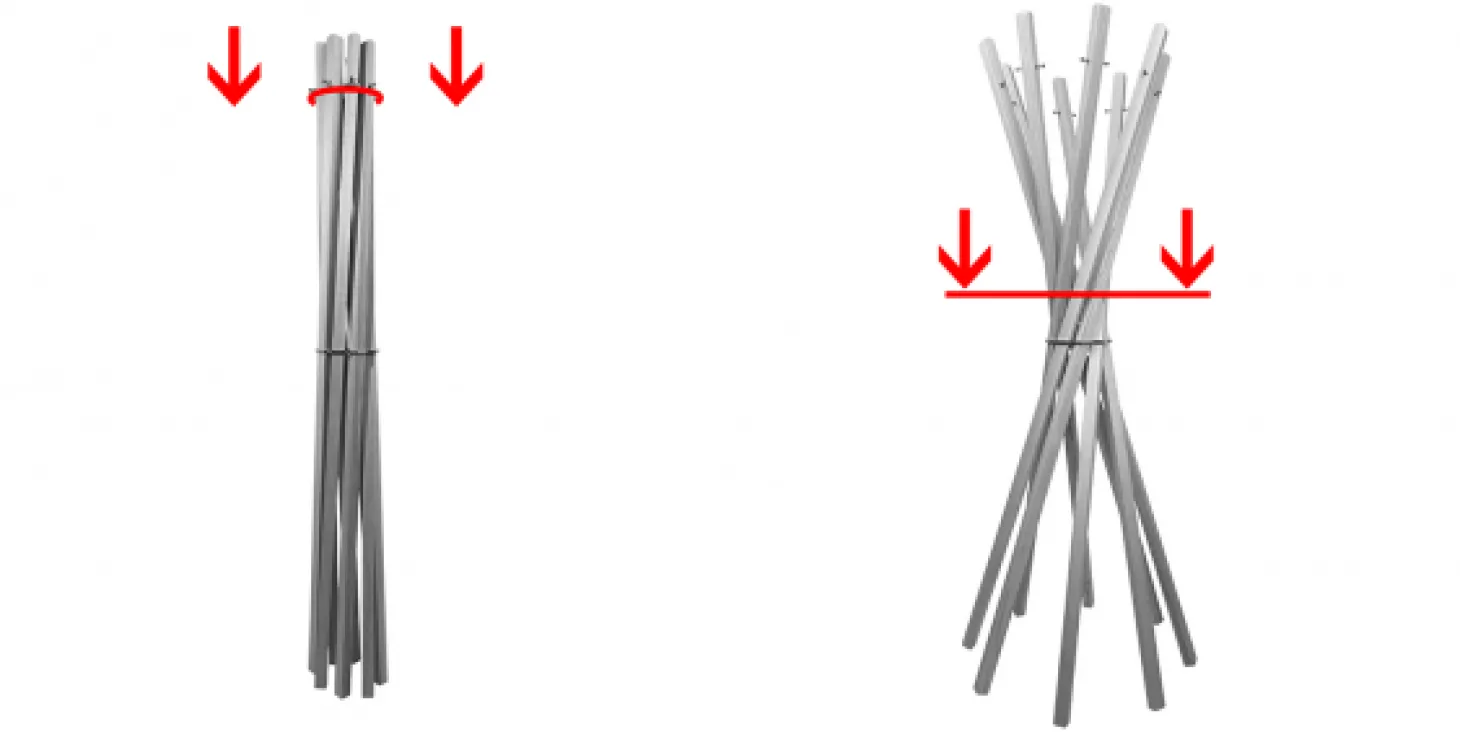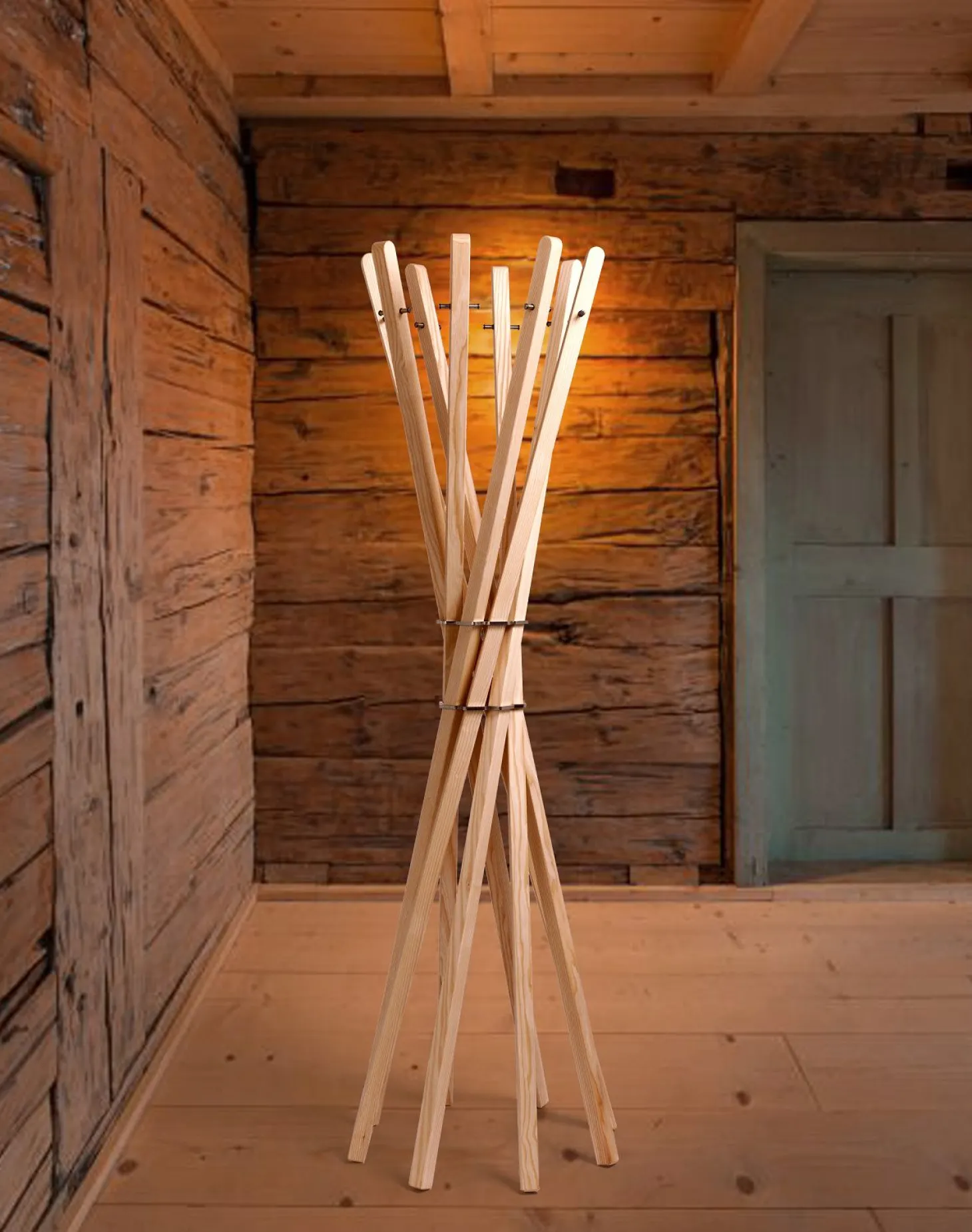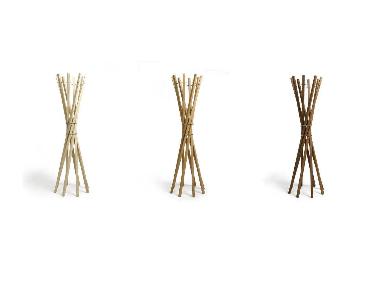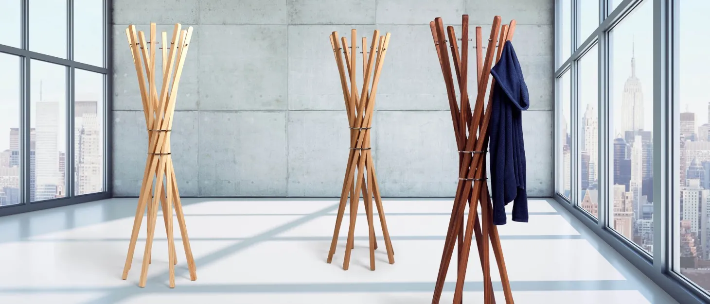 Diese Standgarderobe besteht aus genau acht Stäben mit insgesamt 16 Aufhängemöglichkeiten aus Edelstahl und ist in Esche-, Eiche- und Walnussholz erhältlich.