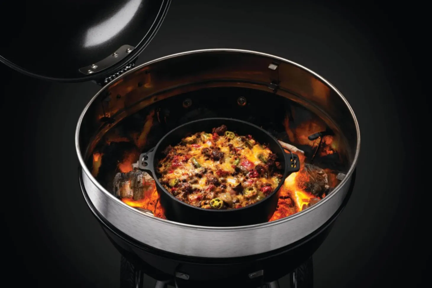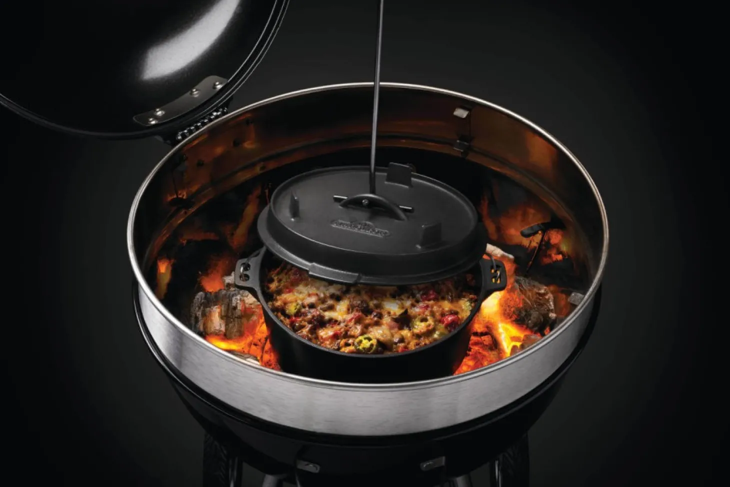 Ein besonderes Highlight dieses Schmortopfes ist der multifunktionale Deckel, der nicht nur den Topf verschließt, sondern auch als eigenständige gusseiserne Bratpfanne verwendet werden kann. Die integrierten Füße am Boden des Topfes und am Deckel sorgen dafür, dass der Topf sicher steht und eine ausreichende Luftzufuhr beim Grillen auf Holzkohle gewährleistet ist. Dies verbessert die Hitzeverteilung und sorgt für perfekte Garergebnisse, egal ob auf dem Gas- oder Holzkohlegrill oder über dem offenen Feuer.