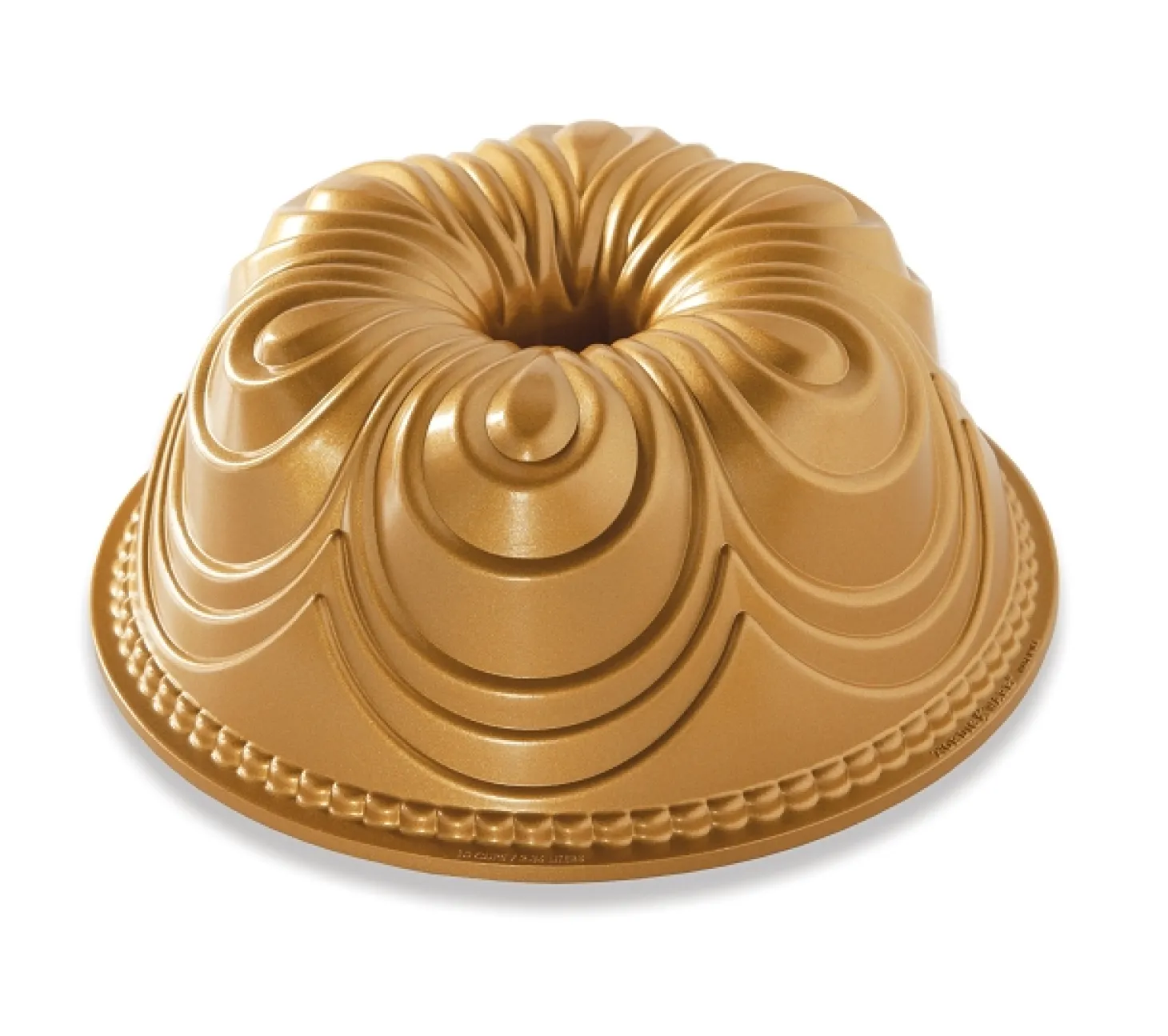Mit der Nordic Ware Backform Chiffon Bundt Pan 2,3 Liter zaubern Sie wundervolle Kuchen zu jeder Jahreszeit. Die Kuchenform aus Aluminiumguss gibt Ihrem Kuchen eine ganz besondere, anmutige Form, die auf jeden Fall die Blicke auf sich ziehen wird. Die feinen Linien laden zum verzieren mit Zuckerguss oder Puderzucker ein. So kommen diese noch besser zur Geltung und Ihr Kuchen wird die Blicke Ihrer Gäste nur so auf sich ziehen. Dank der Antihaftbeschichtung gelingt der Kuchen jedes mal. Die Form nur mit einem sanften Spülmittel per Hand reinigen. Die Form ist nicht Spülmaschinen geeignet.