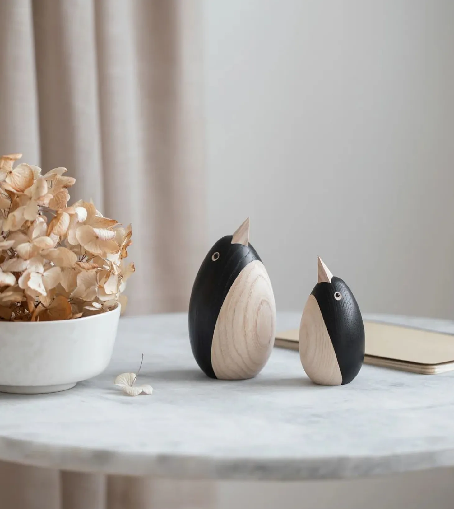 Jede Pinguinfigur wird von geschickten Holzarbeitern mit viel Liebe zum Detail aus FSC-zertifiziertem® europäischem Eschenholz handgefertigt. Sie ist in zwei Größen erhältlich und kommt in den Farben schwarz/natur, was die natürlichen Holzmerkmale unterstreicht und einen schönen Kontrast bietet. Diese handgefertigte Dekoration bringt ein Stück Natur und Symbolik in Ihr Zuhause und ist ein einzigartiges Geschenk oder eine besondere Bereicherung für jede Sammlung.