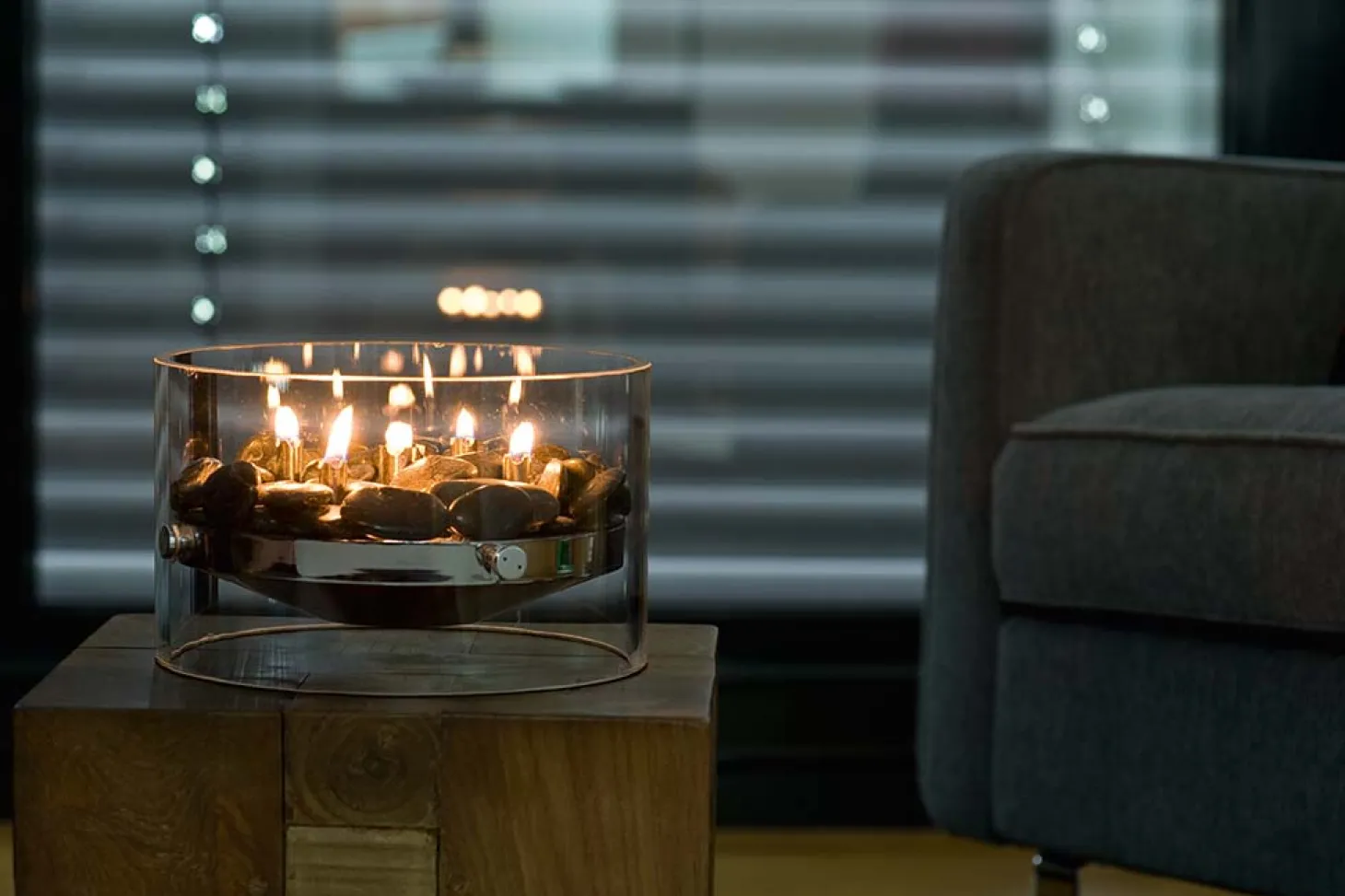 Befüllt wird der Kamin mit duftneutralem Lampenöl. Über fünf Dochte entzündet sich ein sanftes, gleichmäßiges Lichtspiel, das von dunklen Kieseln getragen wird und eine warme, romantische Stimmung verbreitet. Ein Wohnaccessoire, das modernes Design mit gemütlicher Atmosphäre verbindet.