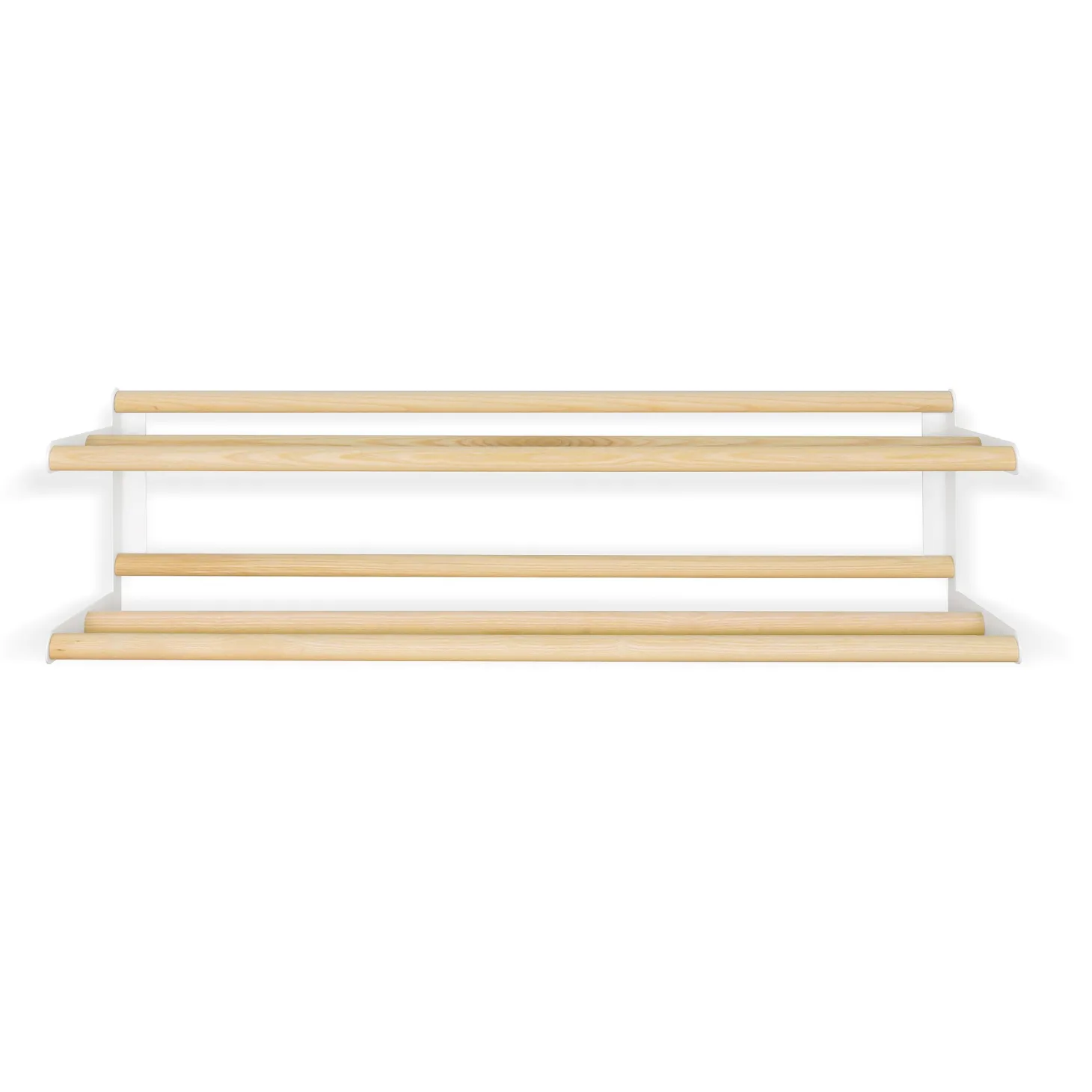 Mit Stixx Wall bekommt die Stixx-Familie Zuwachs – diesmal für die Wand. Das clevere Schuhregal verzichtet auf Bodenkontakt und schafft so luftige Ordnung in Flur, Diele oder Eingangsbereich. Auf zwei Ebenen mit je einem Meter Breite finden 8 bis 10 Paar Schuhe bequem Platz. Und dank der offenen Konstruktion bleibt darunter zusätzlicher Stauraum frei. Gefertigt aus stabilen Eschestäben und schlanken, weißen Metallhaltern, überzeugt Stixx Wall durch sein leichtes, wohnliches Design. Die lichte Höhe von ca. 18 cm zwischen den Ebenen bietet genug Platz – selbst für höhere Schuhe. Ein hinterer Holzstab schützt zudem die Wand vor Schmutz. Das Regal wird flach verpackt geliefert, inklusive aller nötigen Schrauben und Dübel. Wie bei allen Produkten von vonbox stammt das Holz aus nachhaltiger Forstwirtschaft.