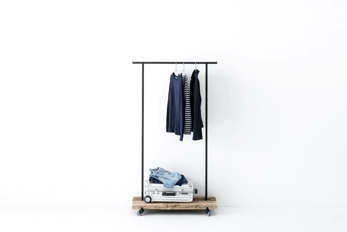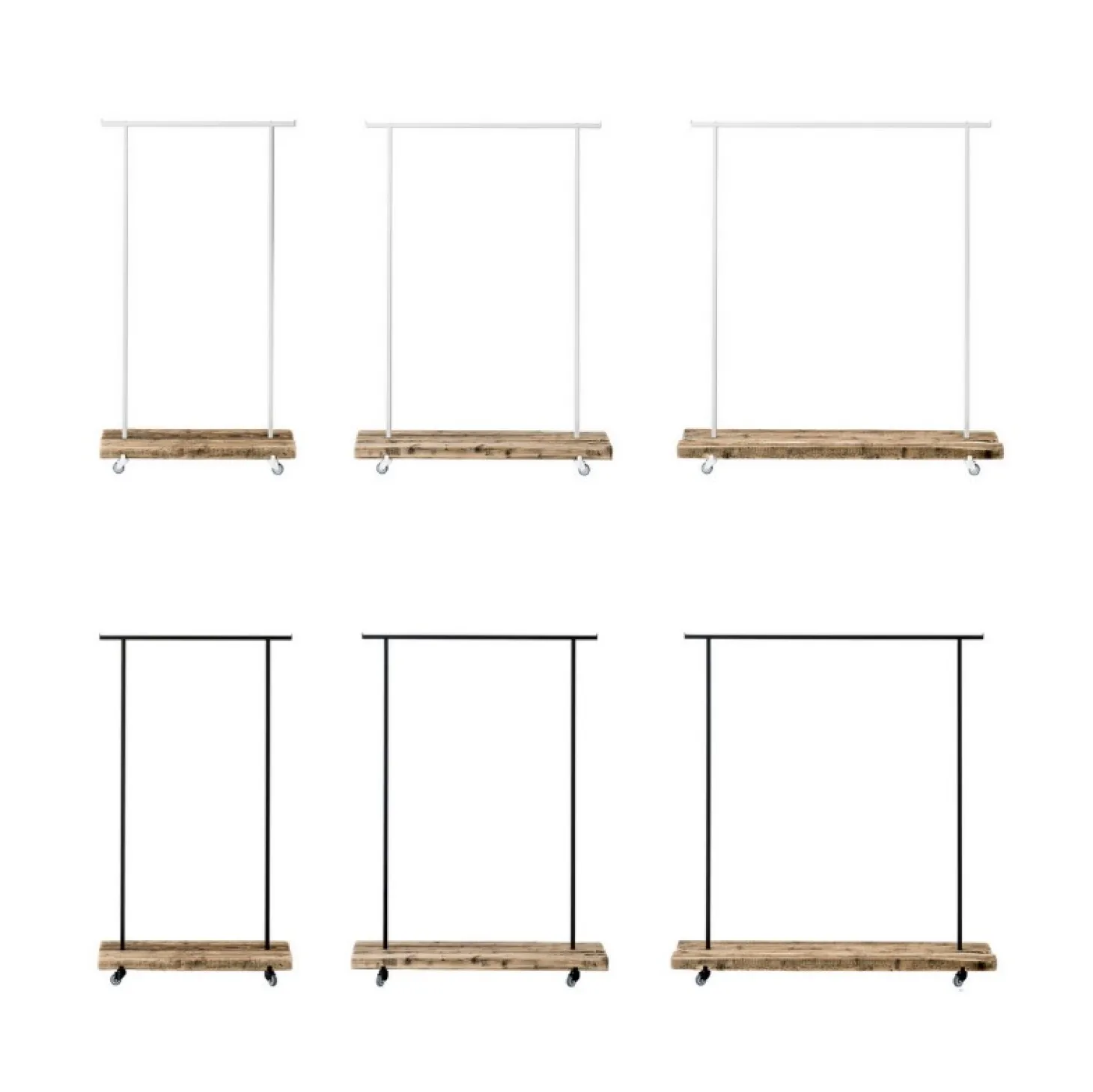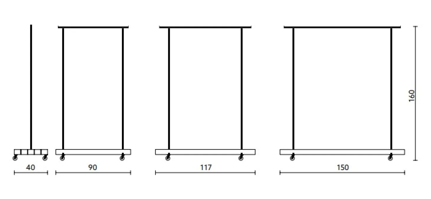 Die Garderobenstangen mit Rollen ist in drei Größen (S 90 × 40 × 160 cm, M 117 × 40 × 160 cm, L 150 × 40 × 160 cm) erhältlich und Ihnen stehen zwei Farben für das Metallgestell zur Auswahl (schwarz und weiß).