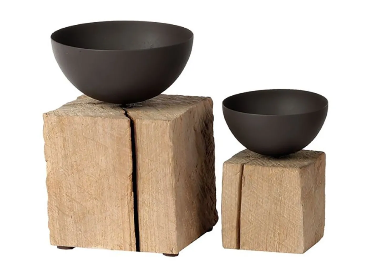 SOPHIA Eisenleuchter von WMG – Dekorativer Purismus auf natürlichem Holzwürfel