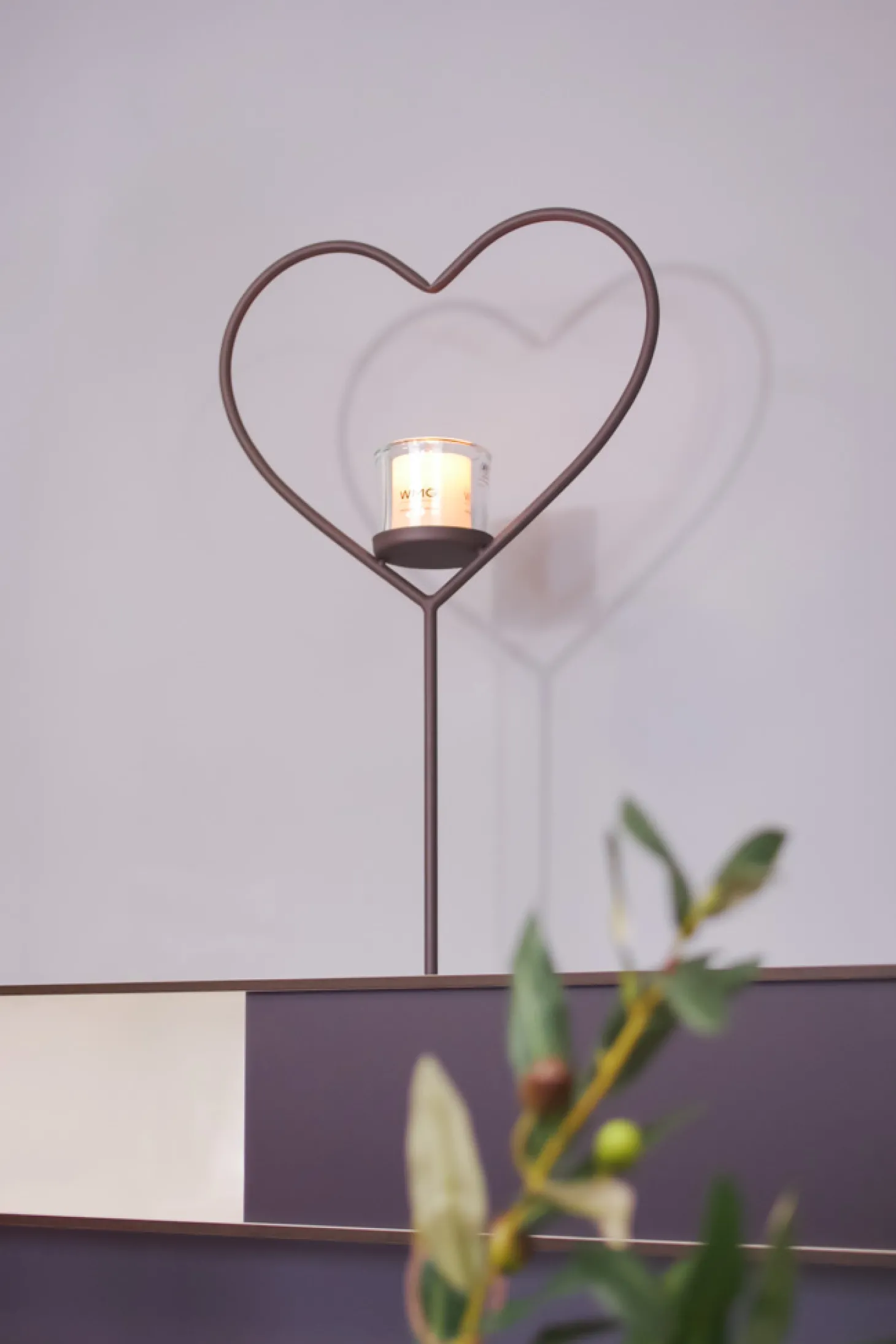 Mit dem Herz-Windlicht Elisa aus Eisen von WMG können Sie einem Ihrer Liebsten oder sich selbst eine kleine Freude bereiten. Das aus runden Stahl geformte Herz steht auf einem stabilen Ständer mit quadratischem Fuß. In der Mitte befindet sich ein formschönes Glas, das Platz für ein Teelicht oder eine kleine Kerze bietet. Verschenken Sie das herzförmige Windlicht zum Muttertag, Valentinstag, Geburtstag oder zu einem anderen Anlass. Durch sein schlichtes Design ist das Deko Windlicht mit Glas für jeden Einrichtungsstil geeignet. Setzen Sie es auf einem Beistelltisch oder einem Sideboard mit weiteren Dekoaccessoires, passend zur Jahreszeit in Szene. Lackiert ist das Herz Windlicht Elisa aus Eisen mit einem hochwertigen, schwarzbraunen Lack. Erhältlich ist das Eisenwindlicht in verschiedenen Größen, die sich auch perfekt miteinander kombinieren lassen.