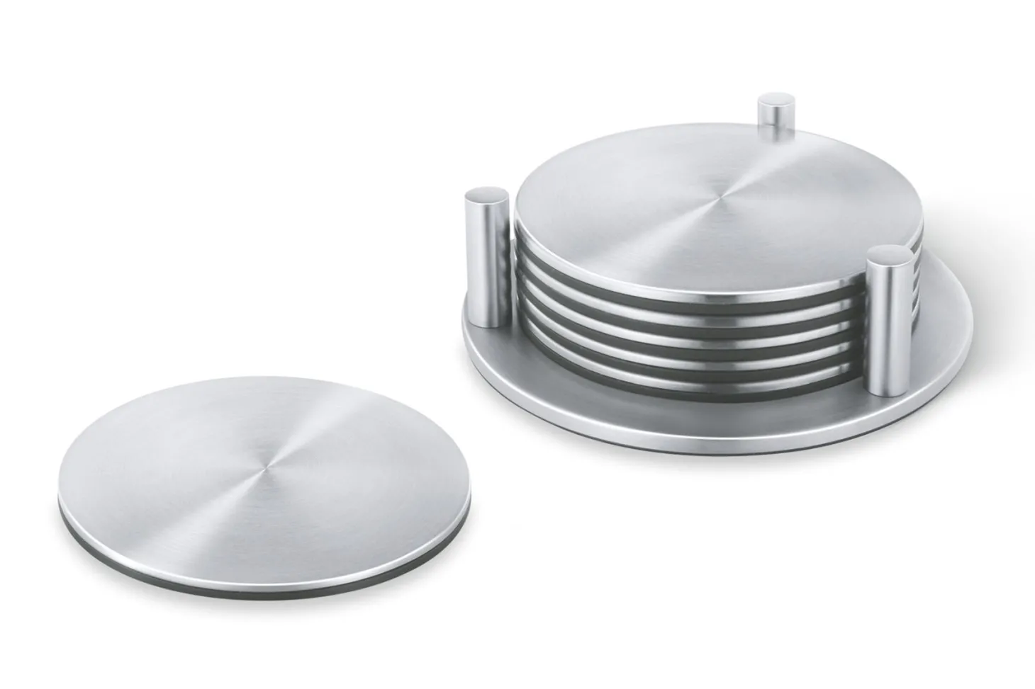 Die Regio 6x runde Untersetzer Set mit Halter von Zack ist eine elegante und praktische Lösung, um Ihre Tische vor unschönen Abdrücken und Kratzern zu schützen. Das Set besteht aus 6 hochwertigen Untersetzern aus 18/10 Edelstahl mit einer exklusiven, matt gebürsteten Oberfläche, die dem Set eine moderne und stilvolle Optik verleiht.