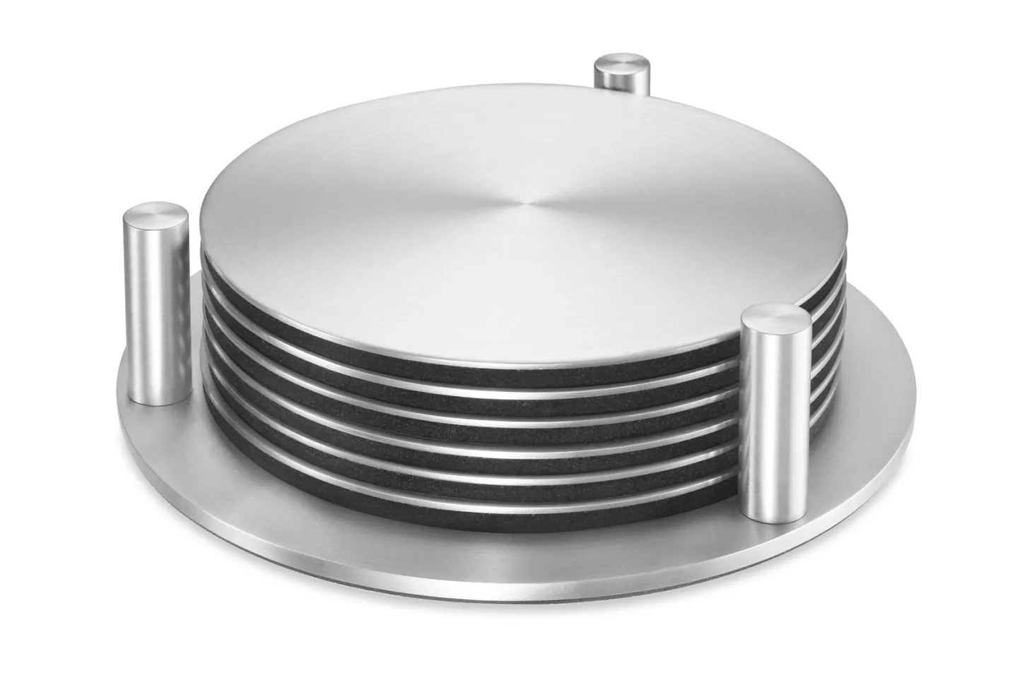 Jeder Untersetzer hat einen Durchmesser von 9,5 cm und wird von einem praktischen Halter aufbewahrt, der einen Gesamtdurchmesser von 12 cm hat. Der Kunststoffpad auf der Unterseite verhindert zuverlässig, dass die Untersetzer empfindliche Oberflächen verkratzen, und sorgt gleichzeitig für einen sicheren Halt.