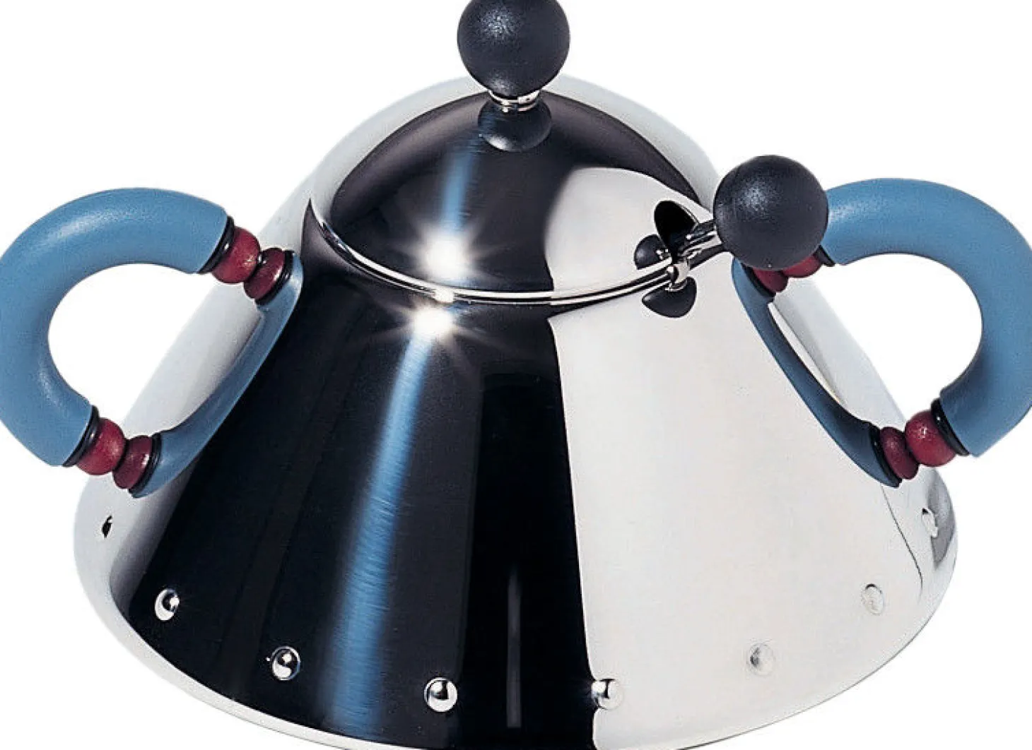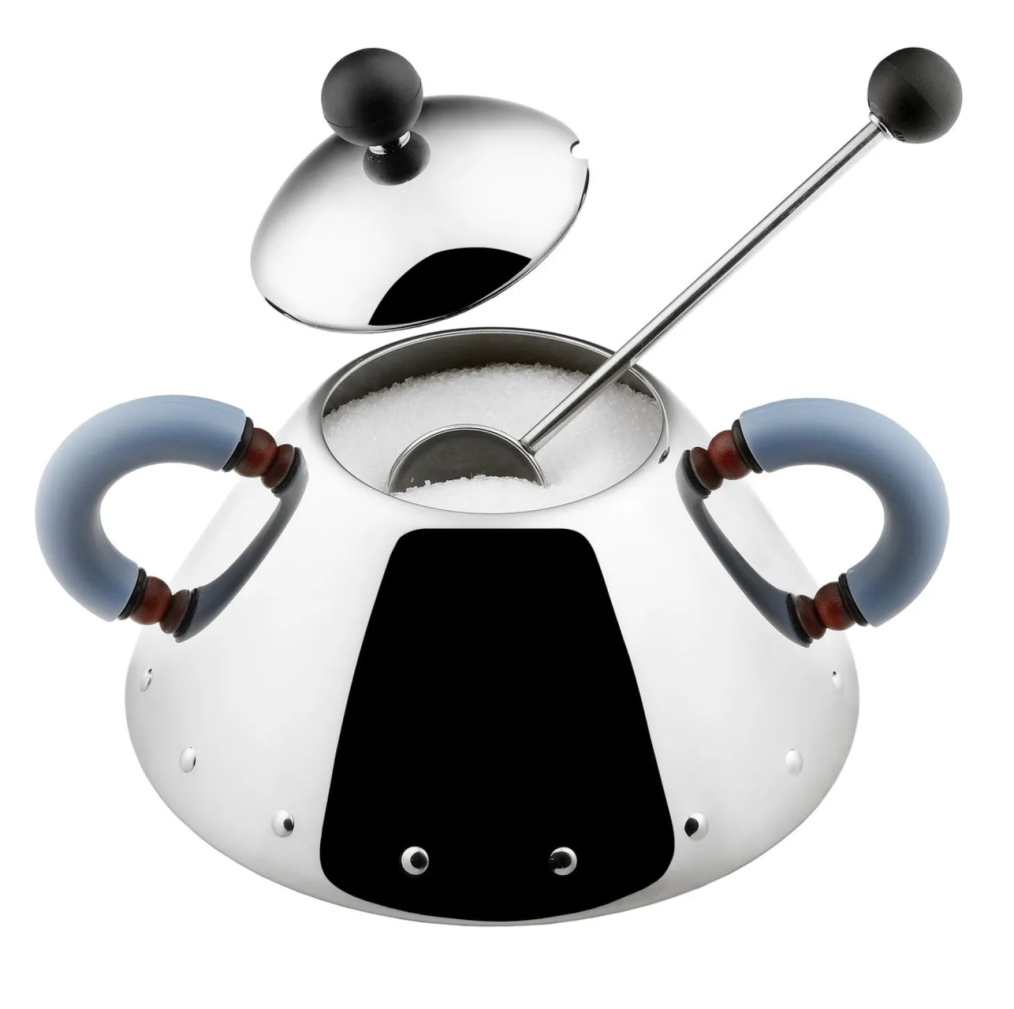Auch die Zuckerdose mit Löffel von einem Designer Alessi’s ist ein gutes Beispiel von Geradlinigkeit und Minimalismus. Die einfache Form der Zuckerdose wird durch das hochwertige Material Edelstahl 18/10 glänzend poliert unterstützt. Die Griffe an der Seite sind aus hellblauem Kunststoff (Polyamid) und der Knopf aus schwarzem Kunststoff (Polyamid) gefertigt. Auch der Löffel wurde aus Edelstahl geformt und ist somit sehr beständig.