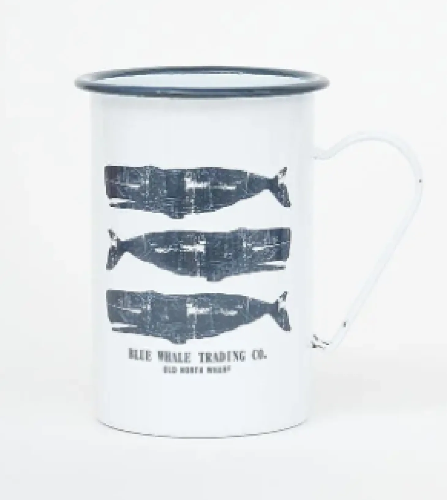 Der Becher hat einen Durchmesser von 8 cm und eine Höhe von 11,5 cm, was ihn ideal für verschiedene Getränke macht. Das Design ist mit drei in Marineblau bemalten Walen und dem Schriftzug „Blue Whale Trading Co.“ versehen, was dem Becher eine exklusive und charmante maritime Note verleiht.