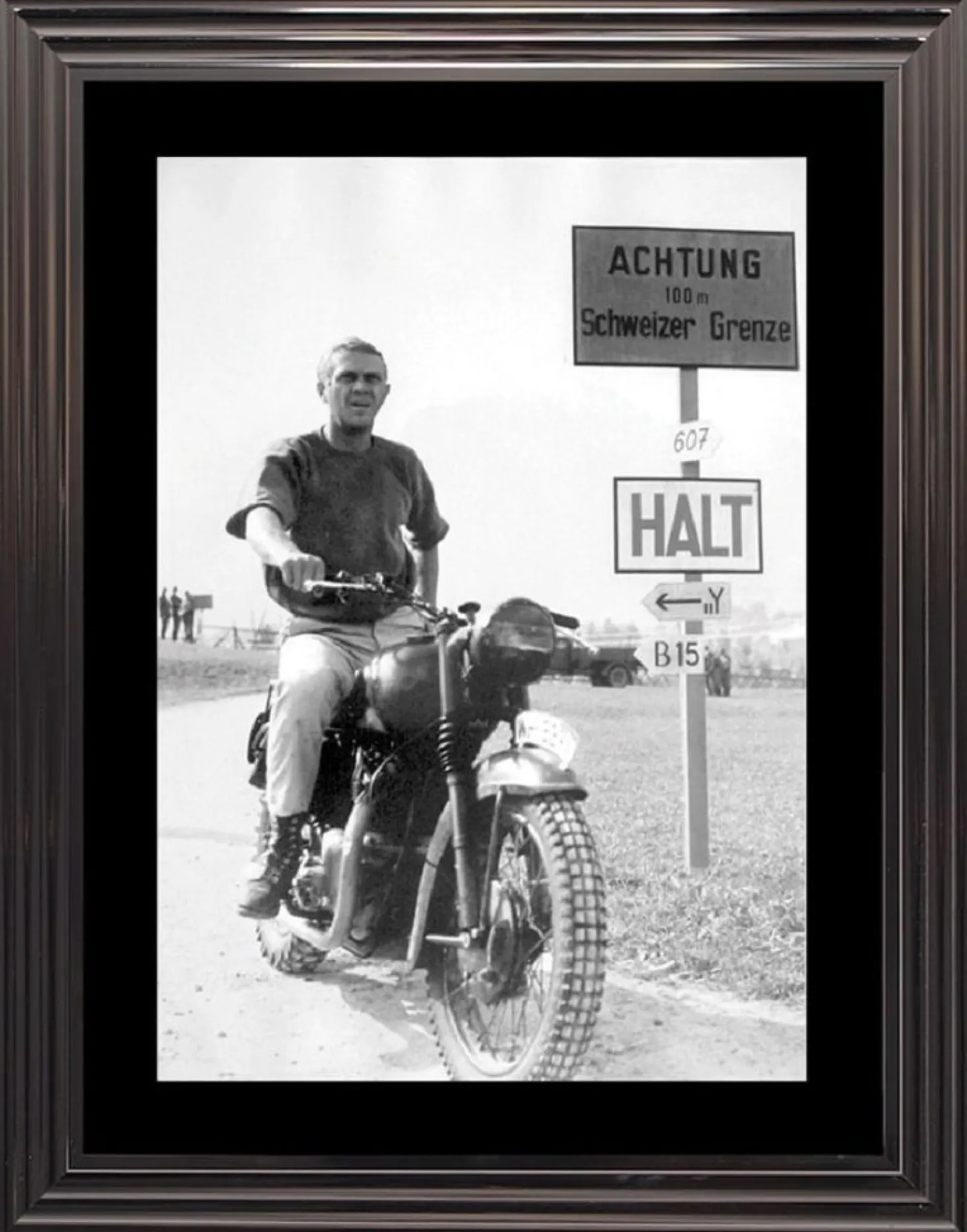 Auf dem Bild ist der Schauspieler Steve McQueen ,aus dem Film „Grande Evasion“, wo er Captain Virgil Hilts spielte, abgebildet. Das Bild ist schwarz weiß gedruckt und erzeugt einen schönen Retrostil in Ihrem Zuhause. Ideal für alle Filmbegeisterte und Retrofans.