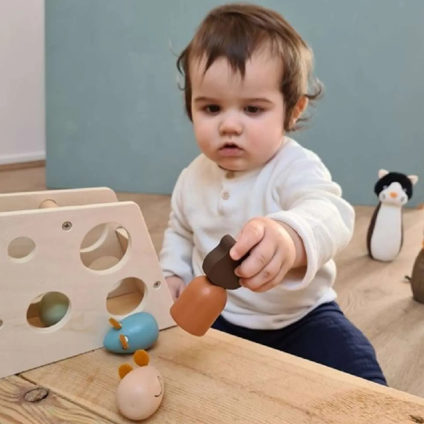Das Stacking Cheese Spielzeug fordert dazu heraus, die richtige Öffnung für die Maus und die Katze im Käse zu finden. Das Spielzeug besteht aus Holz und ist umweltfreundlich.