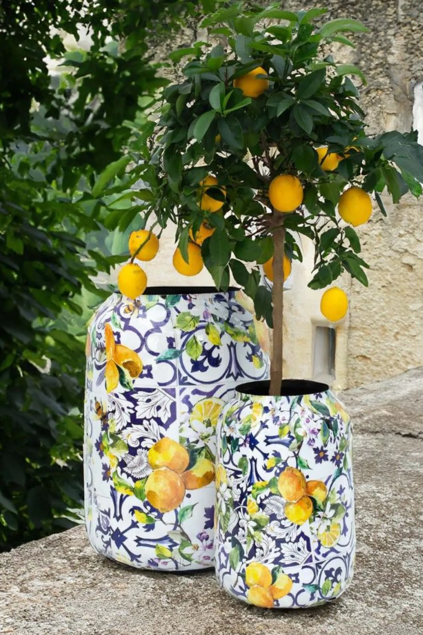 Das Lemon Fusion Pflanzgefäß mit Zitronen-Baum-Muster von Fleur Ami bringt mediterranen Flair in Ihre Wohnräume und sorgt für einen erfrischenden Hingucker. Hergestellt aus hochwertigem Aluminium, vereint es Robustheit mit einer leichten Handhabung. Besonders ins Auge fällt das kunstvoll gestaltete Zitronen-Baum-Muster, das in lebhaften Farben erstrahlt und auf einem stilvollen weiß-blauen, gekachelten Hintergrund perfekt zur Geltung kommt.