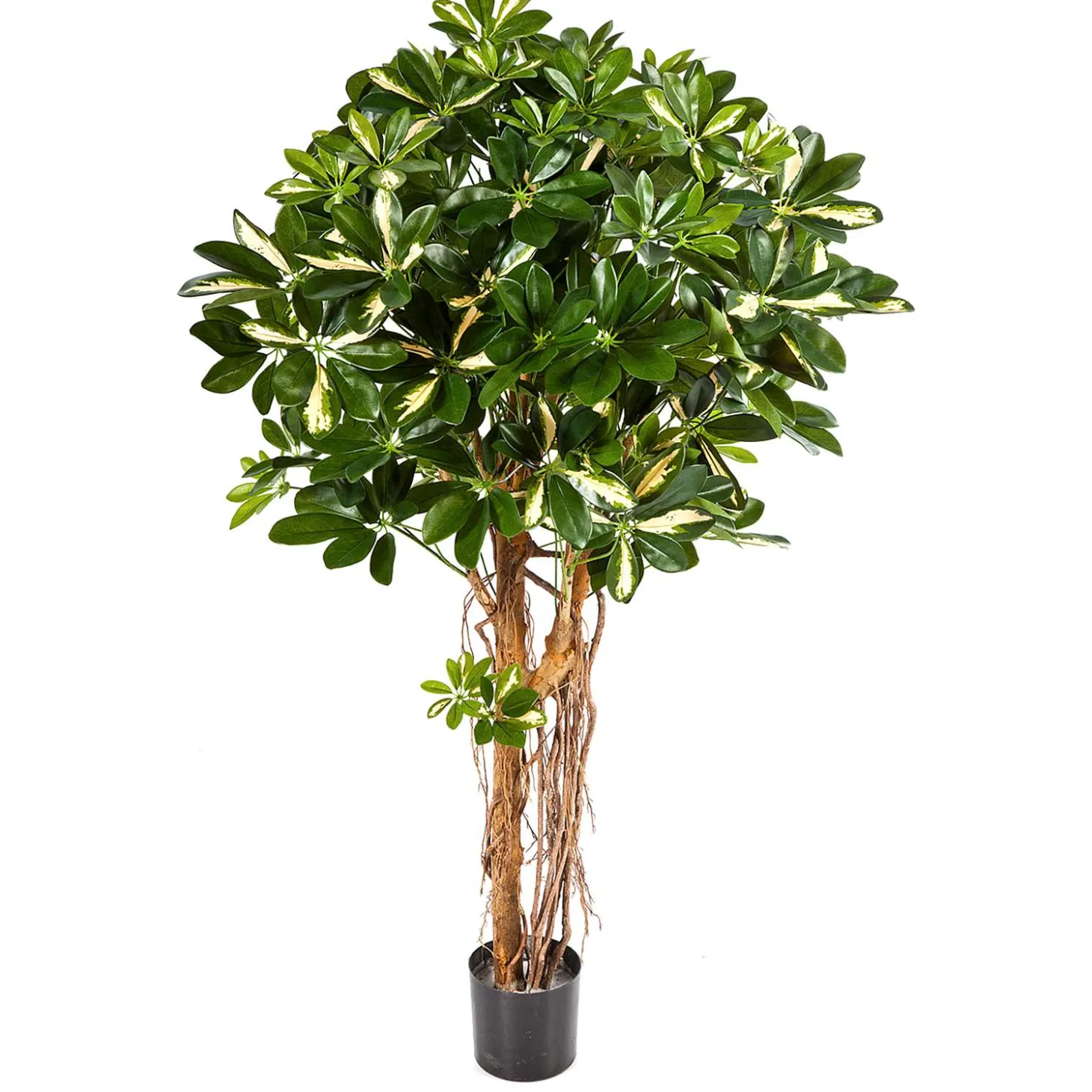 Die 150 cm hohe Strahlenaralie (Schefflera actinophylla) Kunstpflanze von Fleur Ami besticht durch ihre charakteristischen, sternförmig angeordneten, glänzenden Blätter. Diese künstliche Pflanze ist eine pflegeleichte und langlebige Dekorationslösung, die keinerlei Bewässerung oder Pflege benötigt.