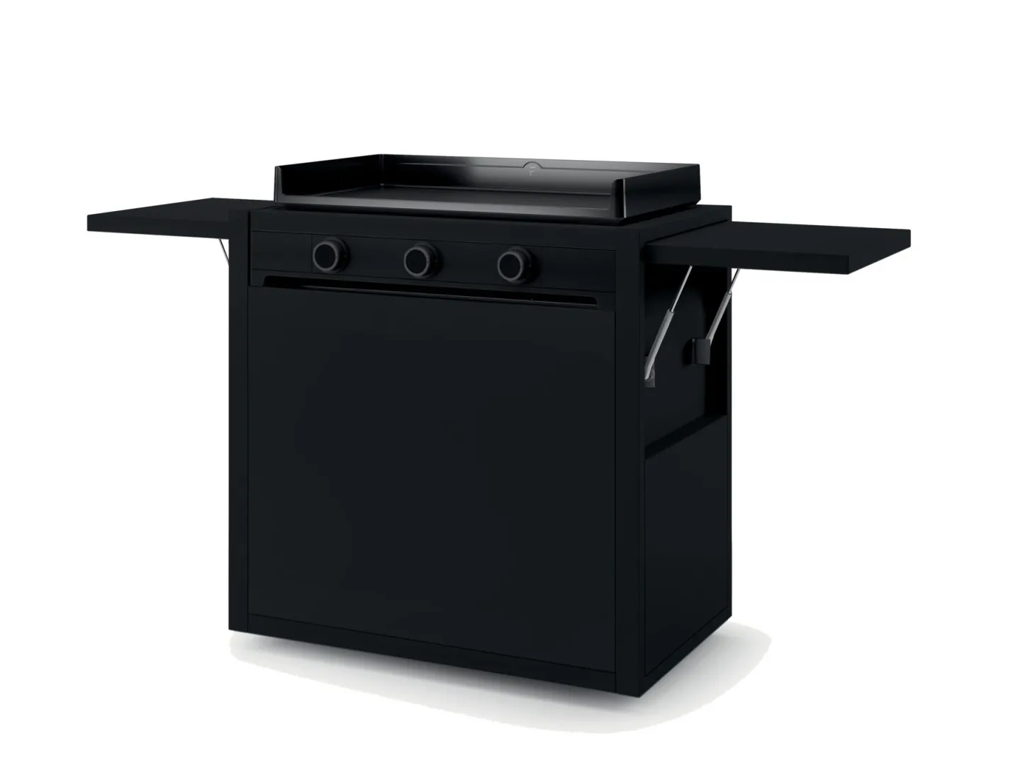 Der Rollwagen Modern 75, gefertigt aus 3-fach pulverbeschichtetem Stahl, ergänzt die Plancha perfekt. Die sichere Verschraubung garantiert stabilen Halt, während die seitlichen Klapptische zusätzlichen Ablageplatz für Zutaten und Grillzubehör bieten. Die robusten Rollen ermöglichen ein einfaches Verschieben – für maximale Flexibilität, egal ob auf Balkon, Terrasse oder im Garten.