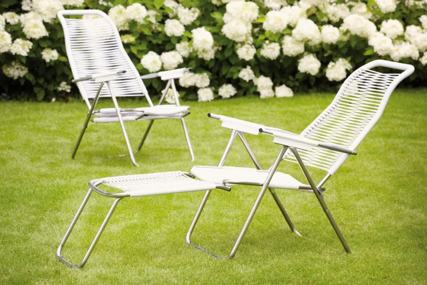 Der Spaghetti Sessel / Liegestuhl von Jan Kurtz ist ein echter Klassiker. Die in den 80er Jahren weit verbreitete Schnürung erlebt hier eine Renaissance. Entworfen wurde der Designer-Liegestuhl von Francesco Favagrossa und ist in 4 schicken und zeitlosen Farben verfügbar. Dank des Gestells aus Aluminium ist der Sessel nur 6 kg schwer und lässt sich so leicht bewegen oder umstellen. Der Outdoor-Stuhl mit der hohen Rückenlehne lässt sich von einer senkrechten Sitz- bis zur Liegeposition, 6-fach verstellen. Ein weiteres Highlight ist das komplett weg klappbare Fußgestell, dieses wird einfach unter die Sitzfläche geklappt, so wird der Liegestuhl zu einem Sessel.