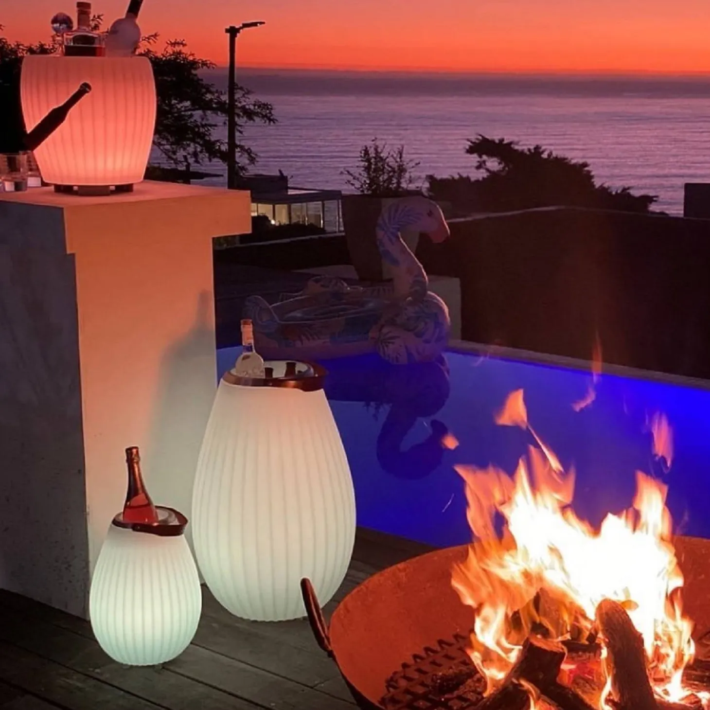 | Eigenschaft: | 4 verschiedene Farbspiel-Optionen, 9 warme Lichtfarben, dimmbar, akkubetrieben, kabellos, Behälter für Eiswürfel oder auch als Blumenvase nutzbar, komplett wasserdicht, Bluetooth Lautsprecher, 10W Breitband Lautsprecher, IP66 Wassergeschützt, Micro-USB-Anschluss 5V / 1A, SYNC-Funktion, Tragegriff aus hochwertigem Rindsleder, Weinkühler für eine Flasche, bedienung per App oder Fernbedienung möglich |