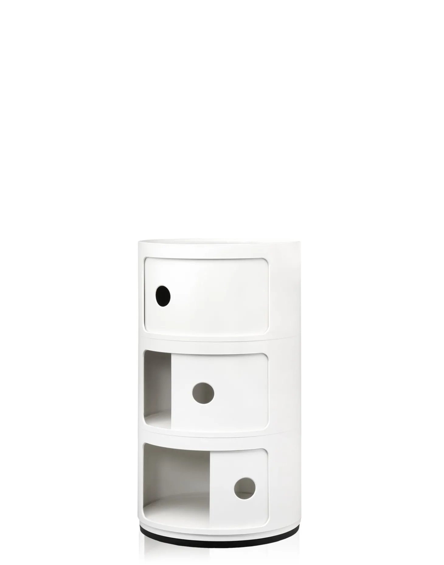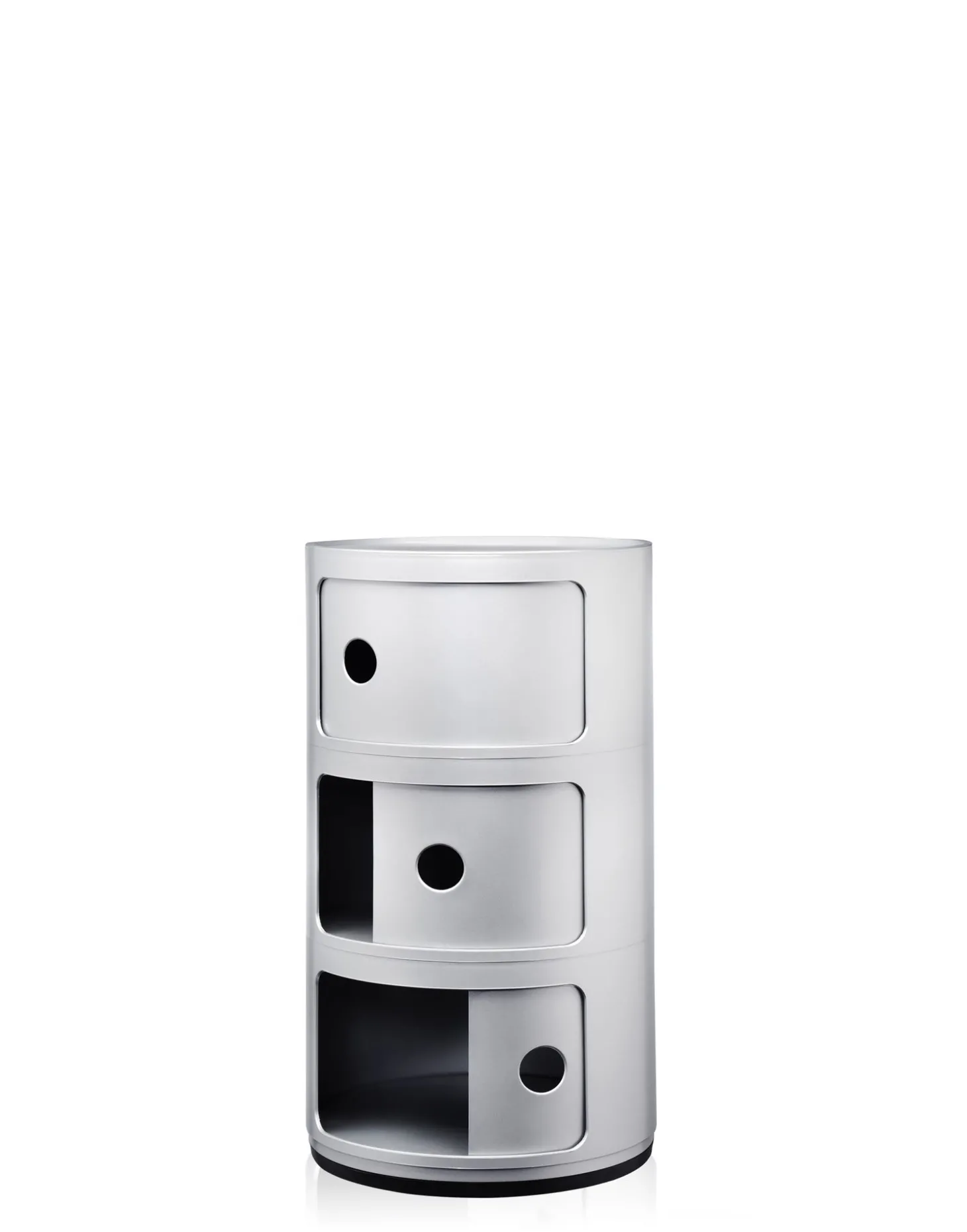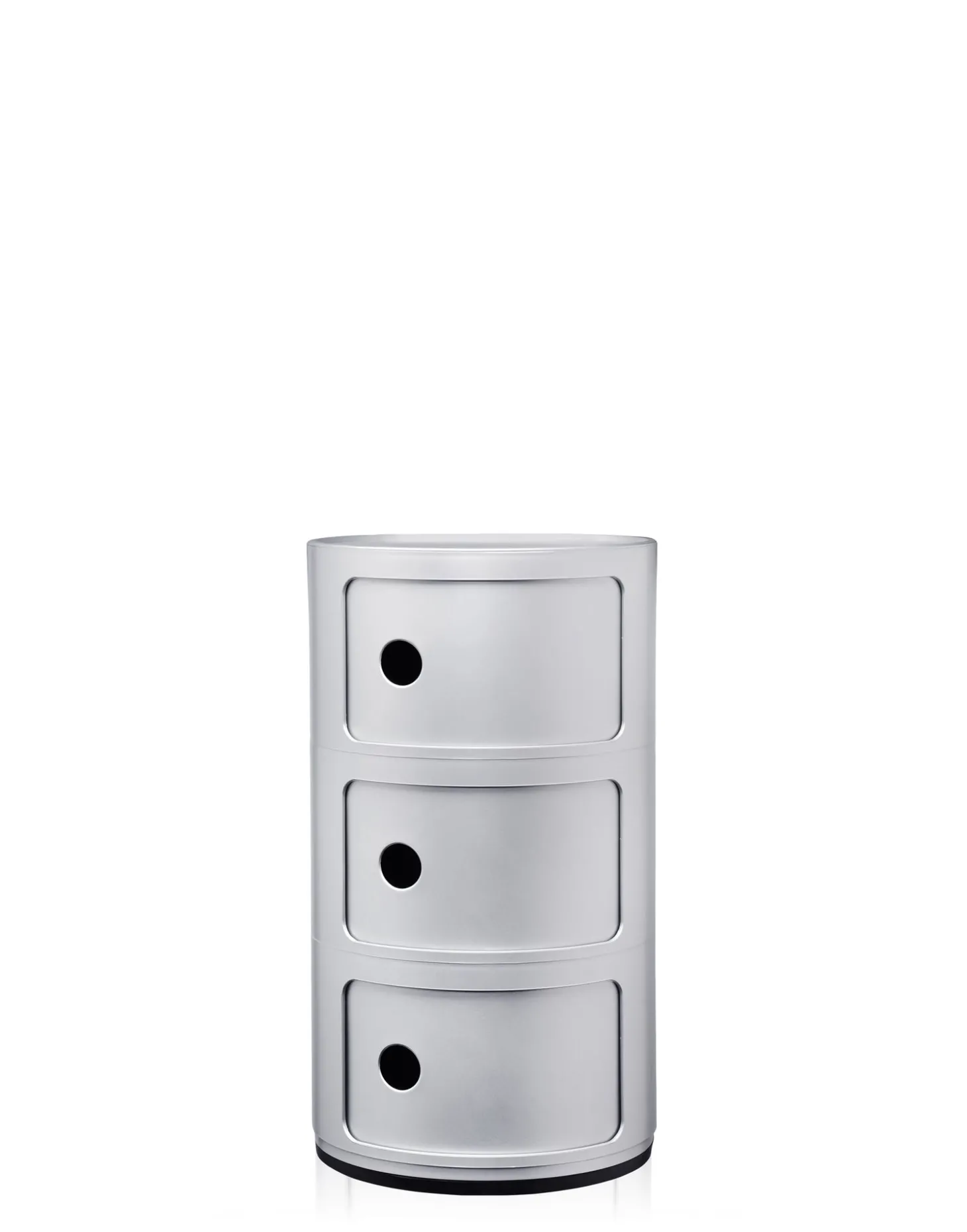 Der Componibili Recyceld Container mit drei Elementen von Kartell sticht durch sein rundes Design hervor. Das Besondere ist, Sie können den Container als Aufbewahrungsmöbel oder als Beistellmöbel am Bett verwenden. Ganz einfach lässt sich der recycelte Container aus drei Ablagefächern durch Grifflöcher öffnen,. Die Maße der Aufbewahrungsbox sind 58,5 cm hoch und der Durchmesser ist 32 cm. Das Material ist thermoplastisches Technopolymer, es ist stabil und robust. Das runde Design passt sich in jedem Zimmer in Ihrem Zuhause an, auch die Farbauswahl zwischen silber und weiß lässt sich zu jedem Einrichtungsstil kombinieren. Bei uns im Shop erhalten Sie auch den Container mit zwei Elementen oder mit drei Elementen in den Farben gelb, grün oder rosa.