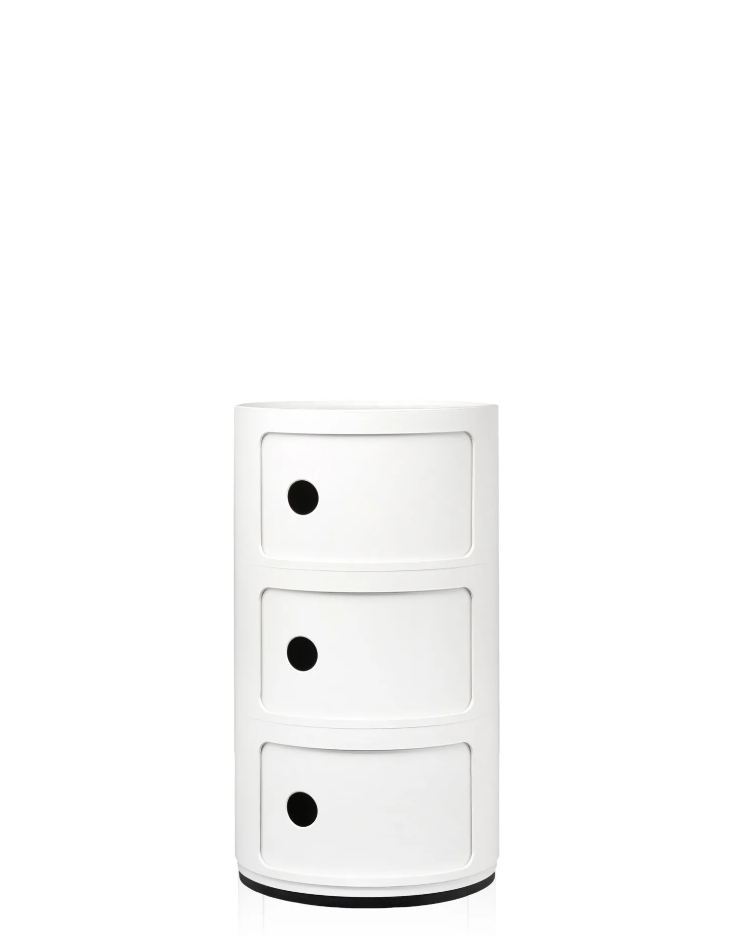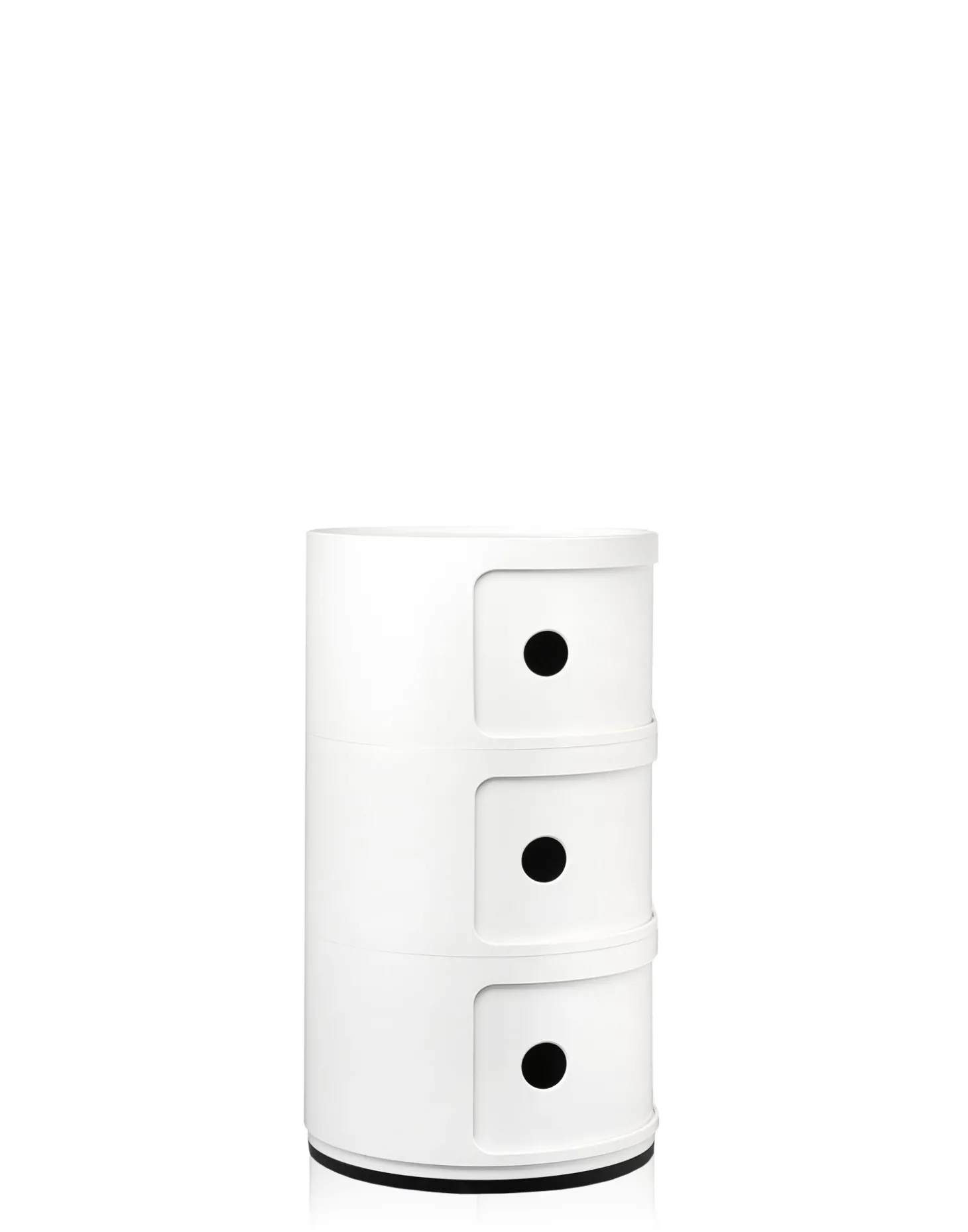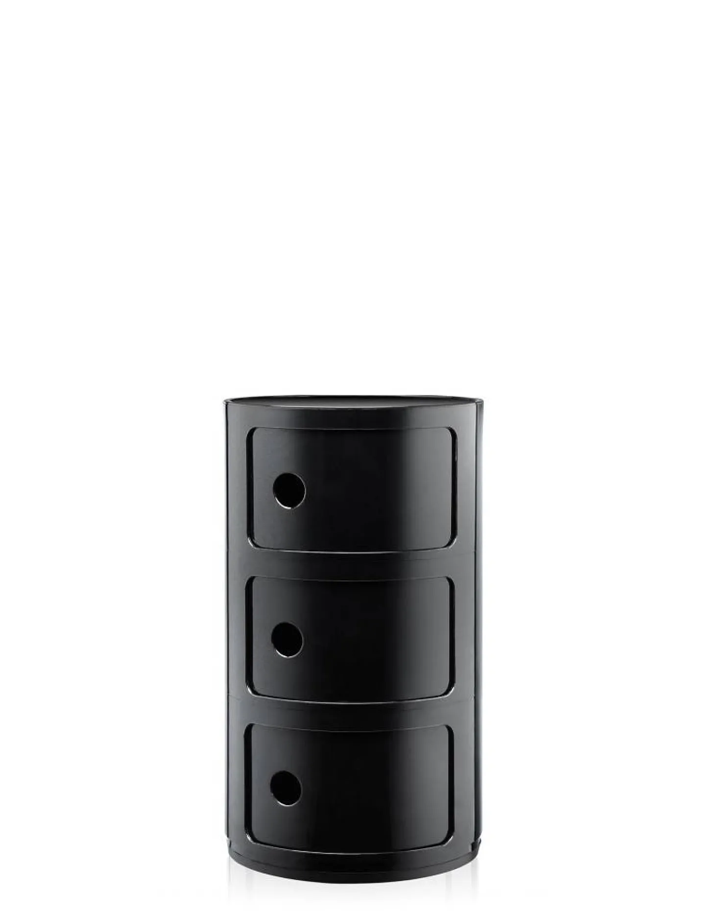 Der Componibili Recyceld Container mit drei Elementen von Kartell sticht durch sein rundes Design hervor. Das Besondere ist, Sie können den Container als Aufbewahrungsmöbel oder als Beistellmöbel am Bett verwenden. Ganz einfach lässt sich der recycelte Container aus drei Ablagefächern durch Grifflöcher öffnen,. Die Maße der Aufbewahrungsbox sind 58,5 cm hoch und der Durchmesser ist 32 cm. Das Material ist thermoplastisches Technopolymer, es ist stabil und robust. Das runde Design passt sich in jedem Zimmer in Ihrem Zuhause an, auch die Farbauswahl zwischen schwarz und weiß lässt sich zu jedem Einrichtungsstil kombinieren. Der Componibili Recyceld Container ist bei uns im Shop auch mit zwei Elementen erhältlich.
