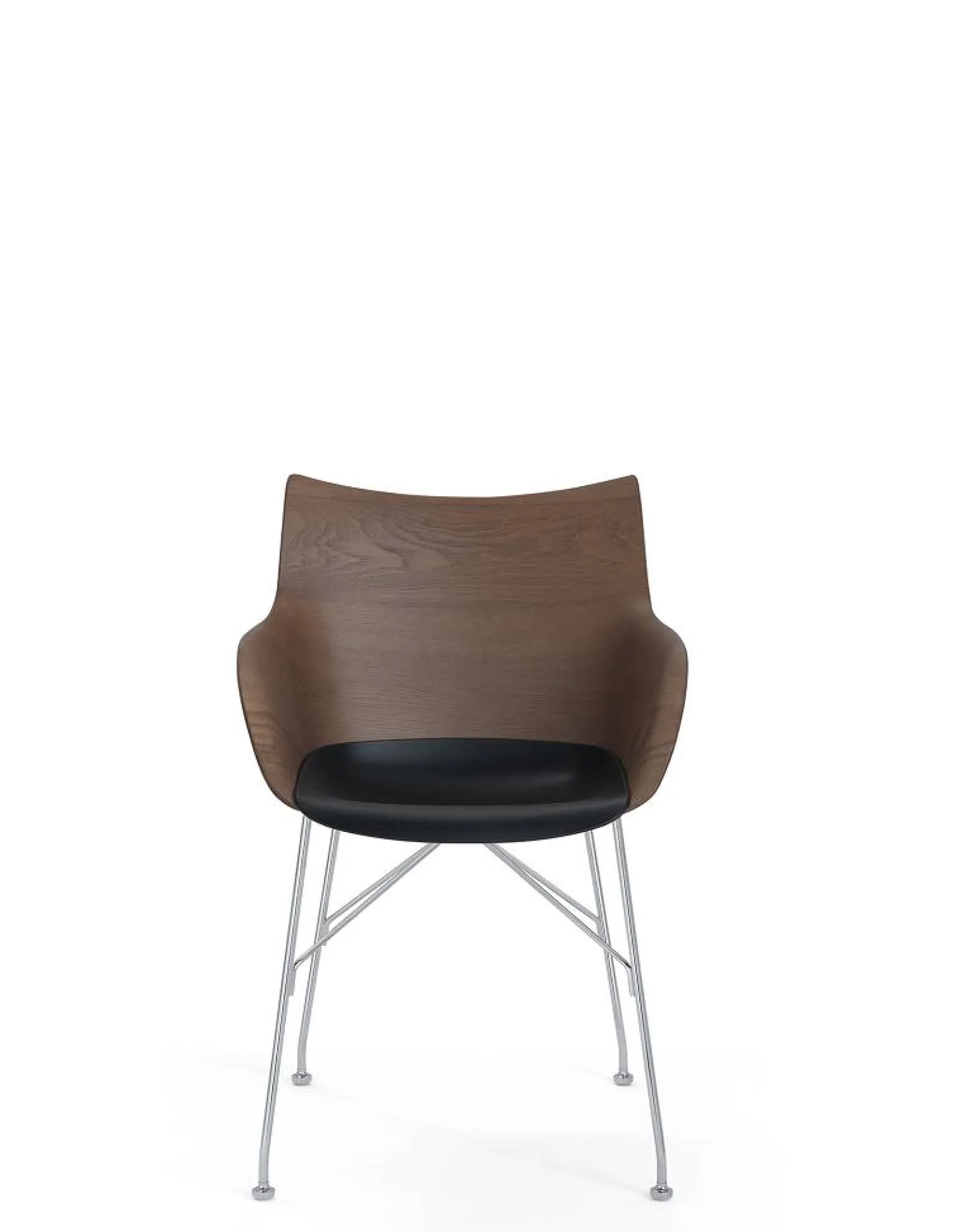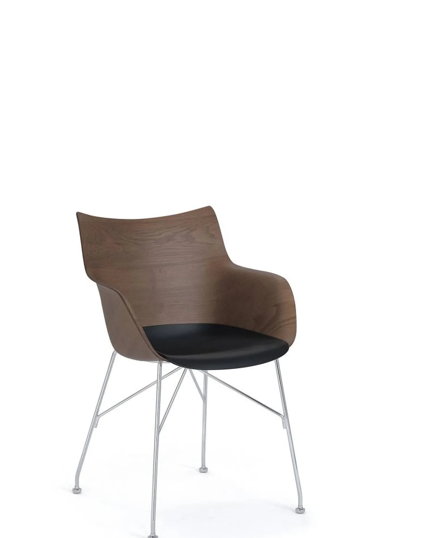 Modern und hochwertig ist der Sessel Q/Wood Sitzschale Holz, Gestell Chrom von Kartell. Das einzigartige ist bei diesem langlebigen Sessel die Form der geschwungenen Sitzschale, welche sehr bequem ist und zum langen Zusammensitzen einlädt. Der Indoorstuhl hat eine Gesamthöhe von 83 cm und eine Sitzhöhe von 43,5 cm. 6,6 kg ist das Gesamtgewicht und erhältlich ist der Sessel mit Armlehnen in einem silbernen verchromten Stahlrahmen, einer Schale aus geschwungenem dunklen 3D-Holz und einem Sitz aus schwarzem thermoplastischen Technopolymer. Geeignet ist der stabile Sessel Q/Wood von Kartell als Schreibtischstuhl oder auch als Esszimmerstuhl, der Ihrem Zuhause eine moderne und gemütliche Atmosphäre verschafft und jeden Gast zum gemeinsamen Essen in Ihrem Zuhause einlädt. Bei uns im Shop erhalten Sie den Q/Wood Sessel auch mit einem schwarzen Stahlrahmen.