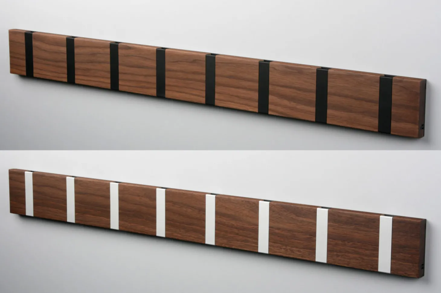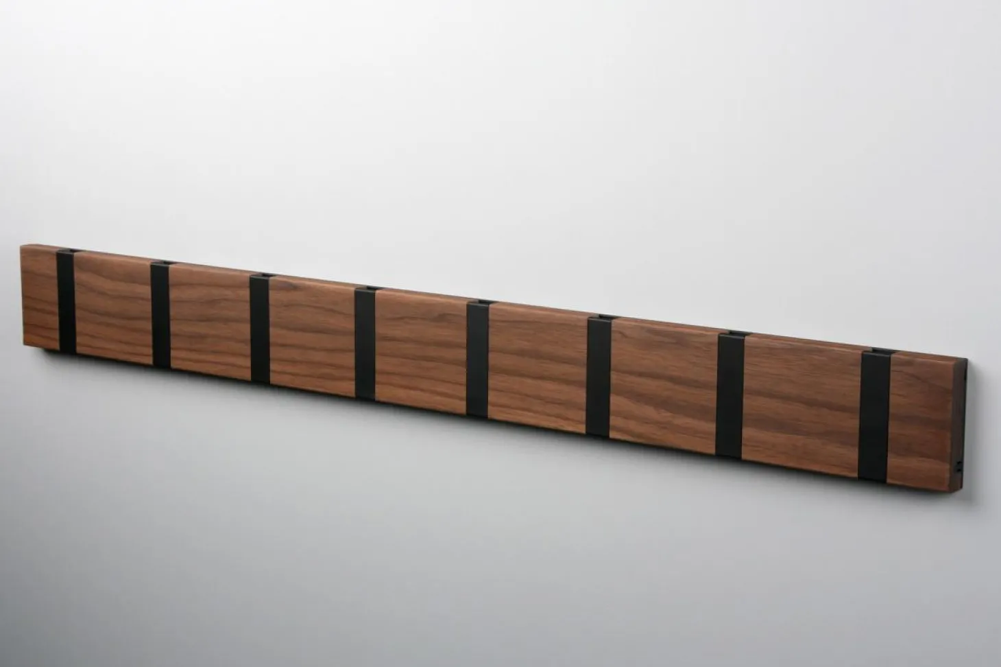 Die Knax waagerechte Garderobenleiste aus Walnuss von LoCa ist eine schlichte Garderobe mit einem hochwertigen Design und guter Qualität. Wenn die Haken nicht benötigt werden, klappen diese automatisch ein und geben zusammen mit dem Massivholz eine glatte Oberfläche. Die Metallplatte an der Rückseite sorgt dafür, dass die Garderobenleiste optimal und sicher befestigt werden kann und stabil ist.