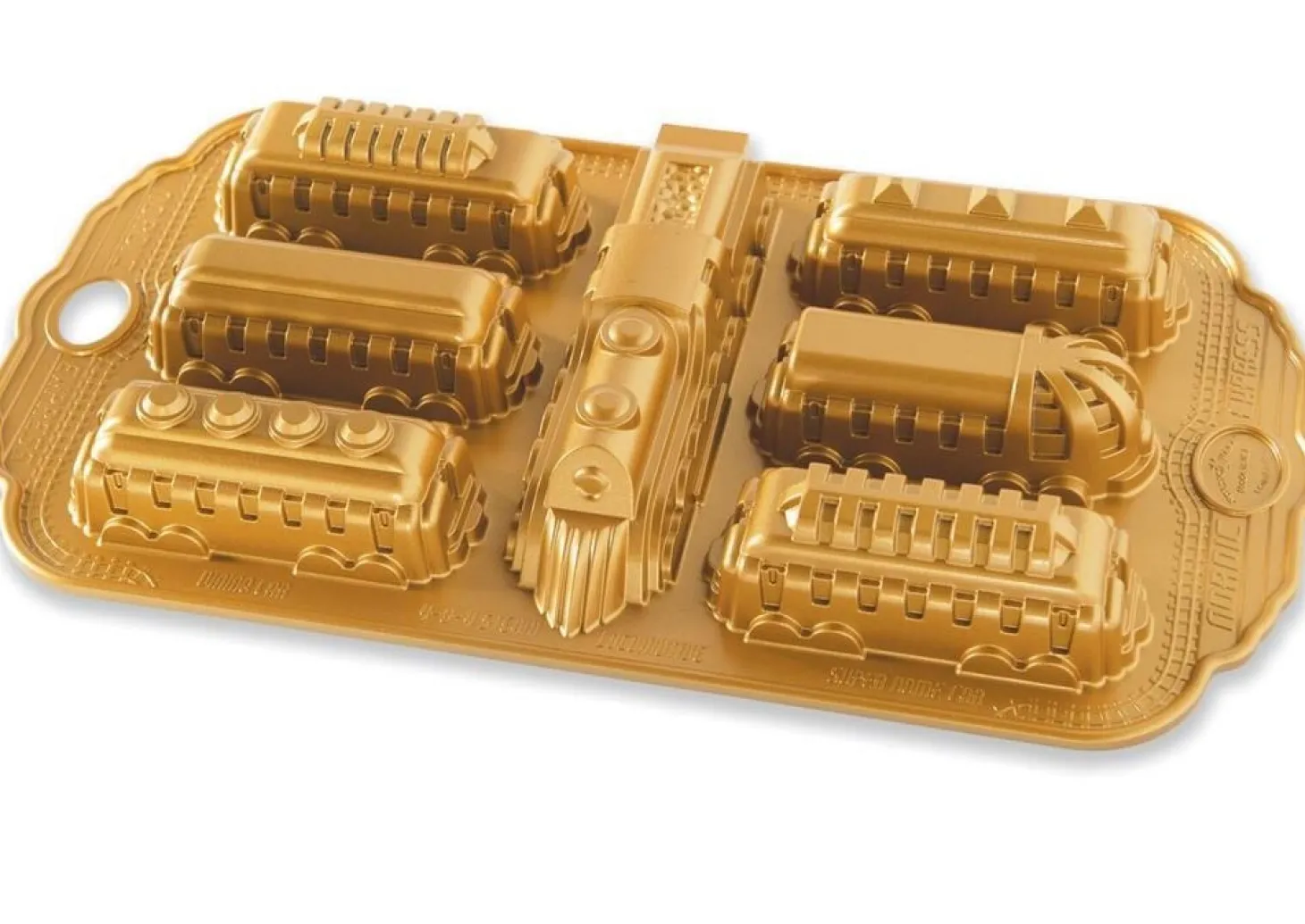 Die Backform Nordic Express Cakelet Pan von Nordic Ware ist der perfekte Weg, um köstliche süße Mini-Kuchen zu backen. Die aus Aluminium gefertigte Backform leitet die Wärme gleichmäßig und sorgt für gleichmäßige Ergebnisse. Die Mini-Kuchen werden jedes Mal perfekt geformt und erhalten eine schöne goldene Kruste. Basierend auf Vintage-Designs enthält die Backform sechs einzigartige Waggons sowie eine klassische Lokomotive. Mit der Backform Nordic Express Cakelet Pan können Sie wunderschöne Kuchenmotive backen, mit denen Sie Ihre Familie und Freunde beeindrucken werden!