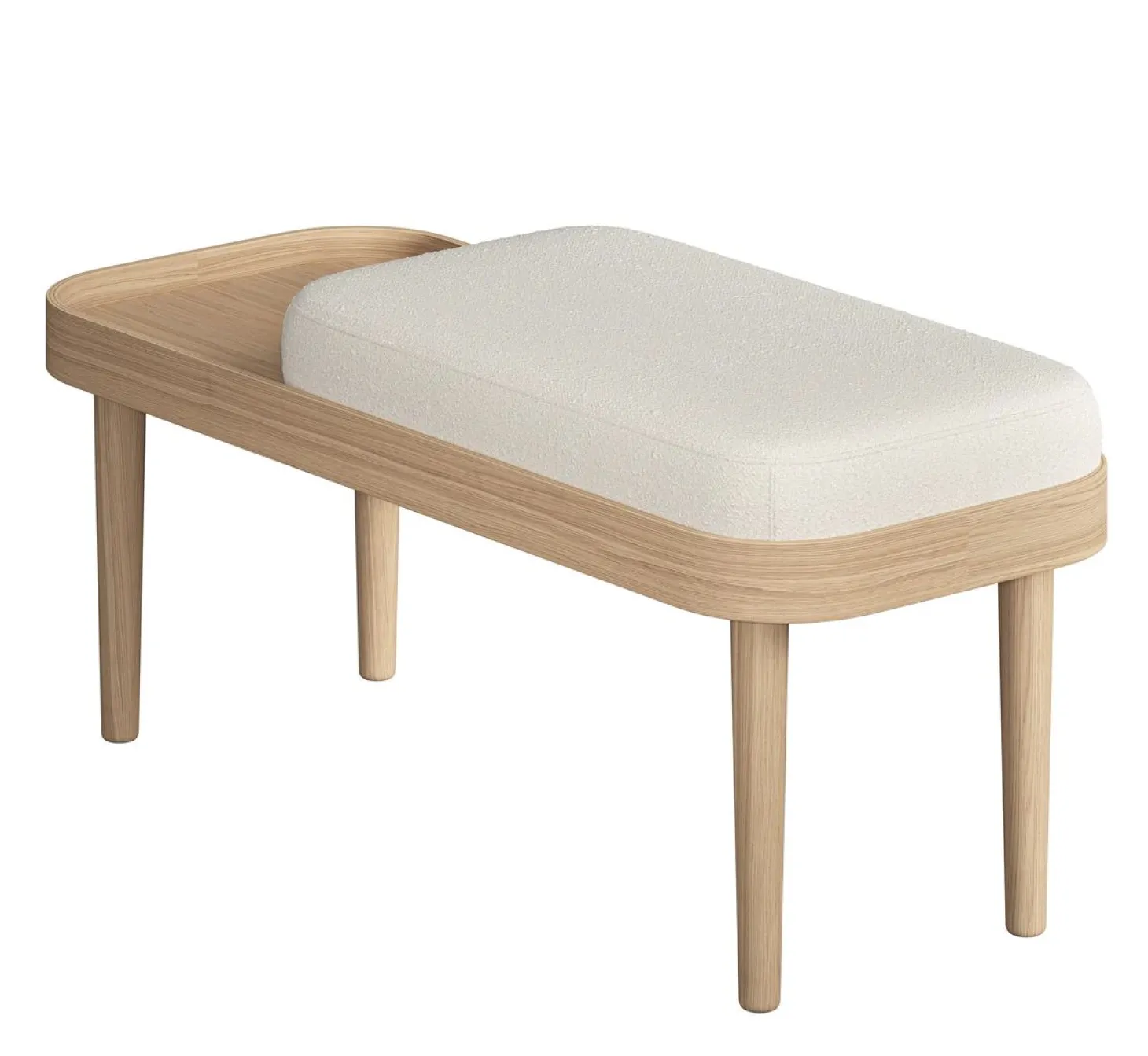 Erhältlich in verschiedenen Farben für die Polsterung und mit einem Gestell in Eiche natur oder dunkel gebeizt, passt die Bank perfekt zu unterschiedlichen Einrichtungsstilen.