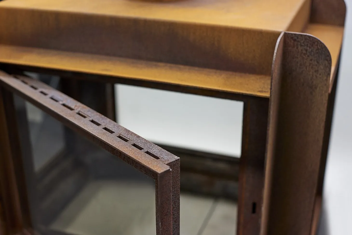 Willkommen in der gemütlichen Welt vom Terrassenkamin Fennek Fuchs 80 von RB73! Dieser erstaunlich hochwertige Terrassenkamin verschönert Ihren Außenbereich mit seinem attraktiven Design und dem natürlichen Rost. Der Kamin wird ungerostet versendet und bekommt seinen charakteristischen Rost erst nach einiger Zeit. Der aus Cortenstahl gefertigte Outdoorkamin verfügt über Streben im Retro-Look, die absichtlich nach außen gedreht sind, was ihm ein besonders rustikales Aussehen verleiht. Die rechte Türleiste verfügt zudem über einen Bügel zum einfachen Öffnen und Schließen der Tür. Der Zusammenbau der Seitenteile könnte nicht einfacher sein. Sie lassen sich leicht montieren und demontieren und sind mit Luftspalten versehen, die ein klares sauberes Glas ermöglichen. Zudem können Sie aus zwei verschiedenen Ausführungen wählen – entweder vier Glastüren oder drei Glastüren und eine Rückwand aus Beton. Erleben Sie ein atemberaubendes Ambiente und Wärme mit dem Fennek 80 Outdoor Kaminofen. Er ist die perfekte Ergänzung, um Ihren Außenbereich in einen stilvollen Treffpunkt zu verwandeln, zu dem Ihre Familie und Freunde gerne kommen werden.