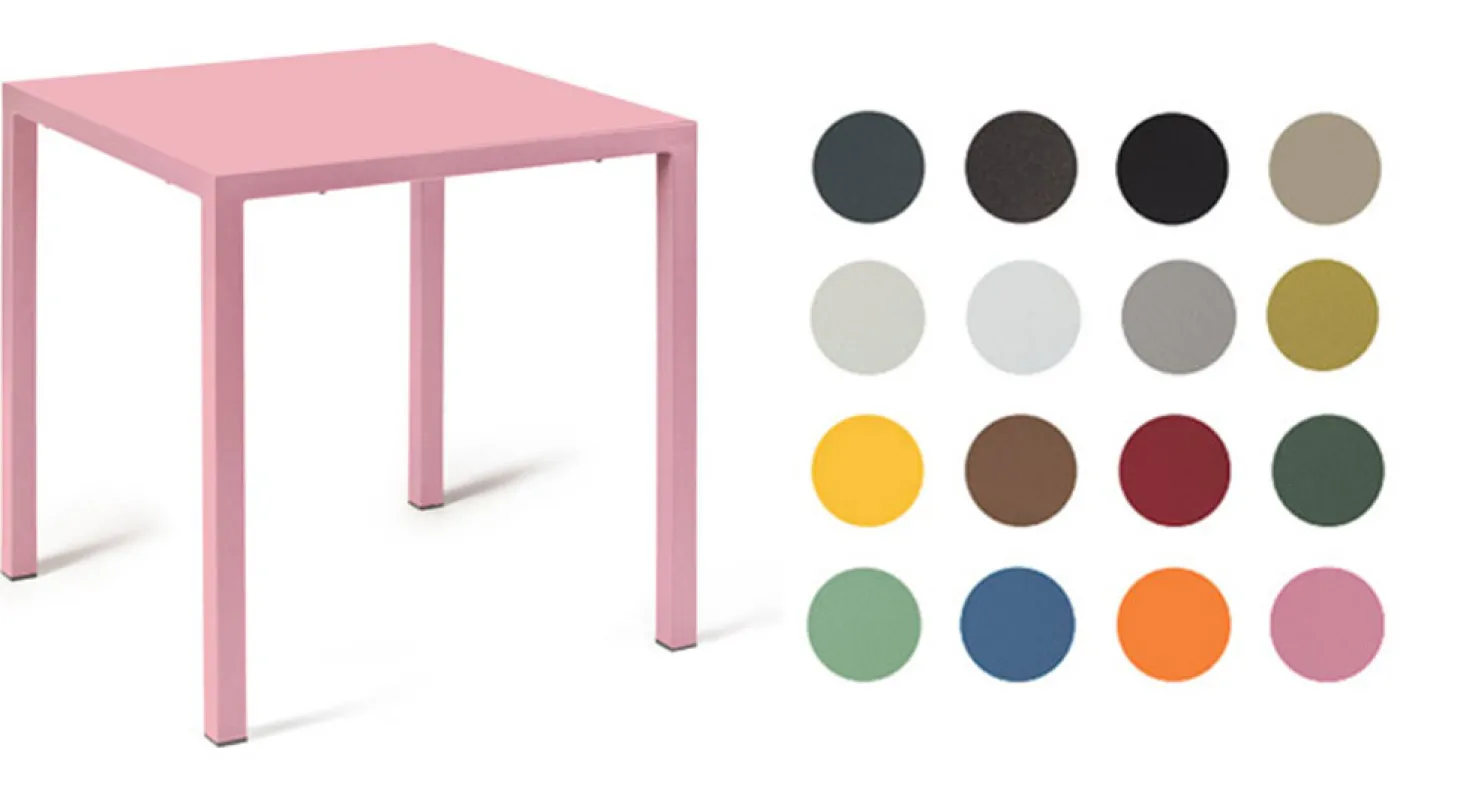 Der Terrassentisch Quatris 80x80x75 cm des italienischen Herstellers Vermobil eignet sich optimal für kleine Terrassen oder Balkone. Verzichten Sie trotz geringem Platz nicht auf eine stylische und gemütliche Sitzgelegenheit, an der Sie im Sommer speisen können. Wählen Sie Ihren neuen eckigen Gartentisch aus einer der zahlreichen knalligen und schlichten Farben. Seine galvanisierte Oberfläche bietet zudem einen optimalen Rostschutz gegen Witterungseinflüsse. Einem gemütlichen Sommerfrühstück oder einem Grillabend steht nun nichts mehr im Wege.