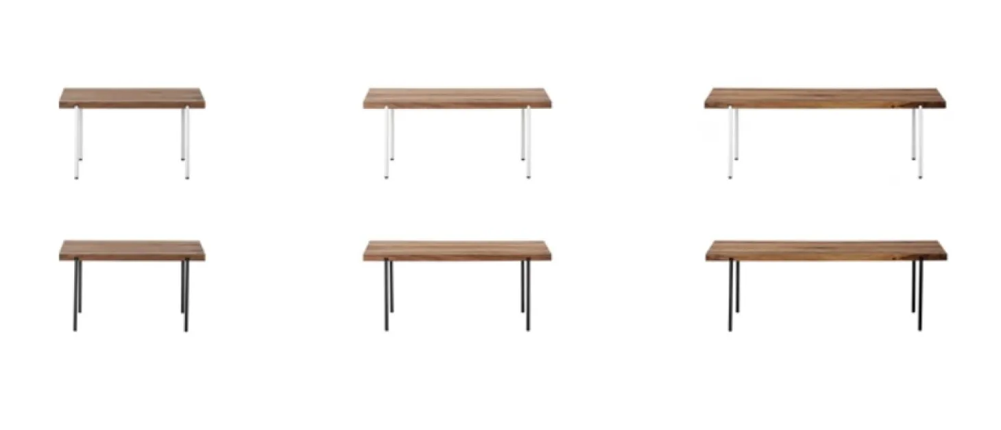 Die massivholz Sitzbank ist in drei Größen erhältlich und bei der Farbe des Metallgestells kann zwischen schwarz und weiß gewählt werden.