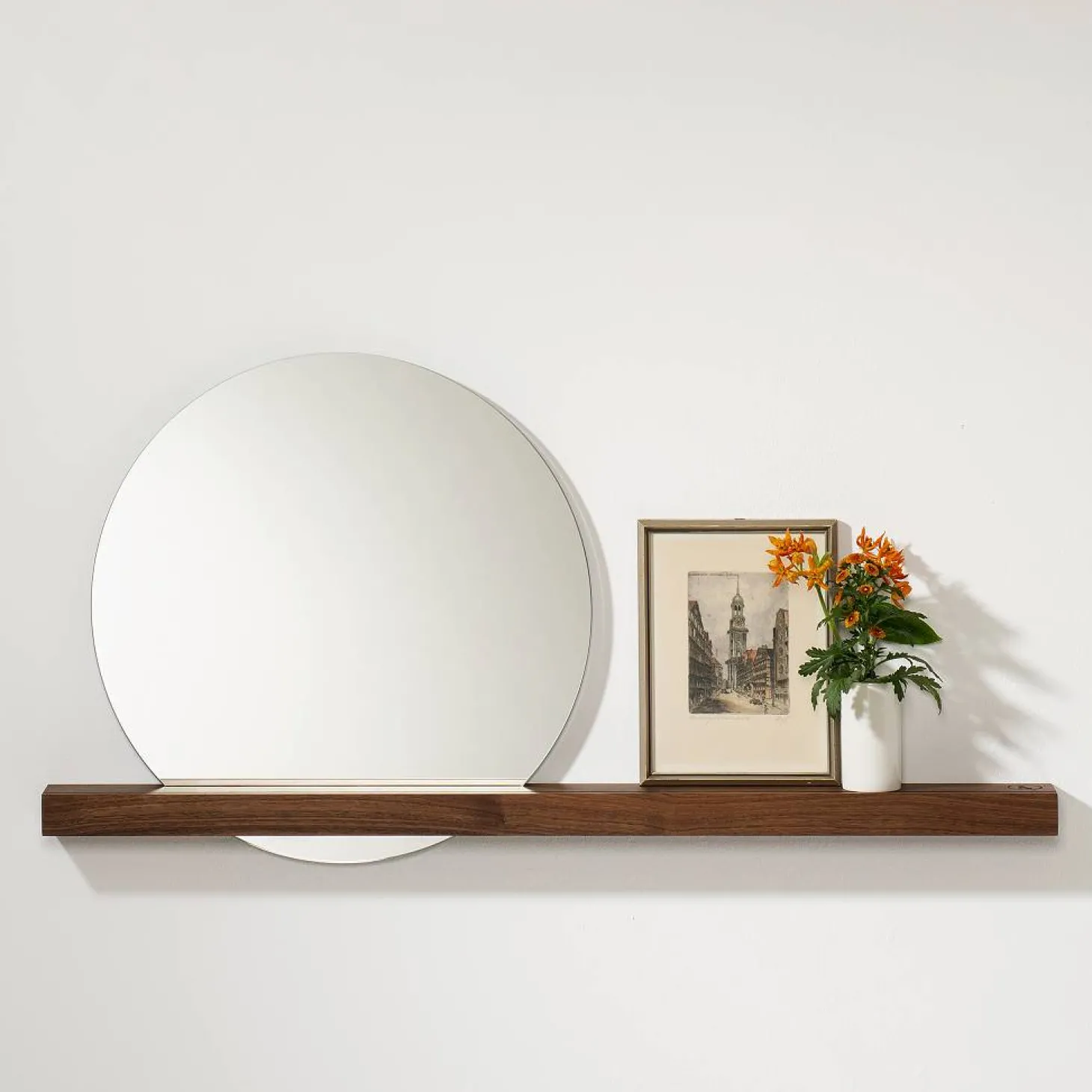 Produktinformationen „Wandspiegel mit Nussbaumholzablage 100 × 7,5 × 4 cm, Spiegel Ø 50 cm rechts“