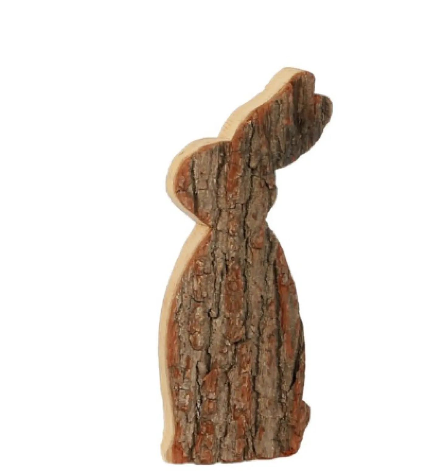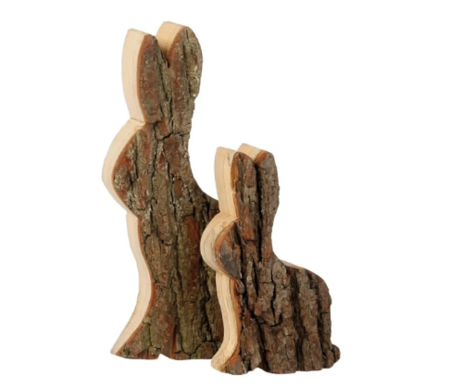 Jeder Hase wird mit großer Sorgfalt aus hochwertigem Holz gefertigt und mit echter Rinde akzentuiert, was ihm eine einzigartige und markante Textur verleiht. Diese Kombination aus Holz und Rinde schafft ein atemberaubendes visuelles Erlebnis, das jeden Raum aufwertet.