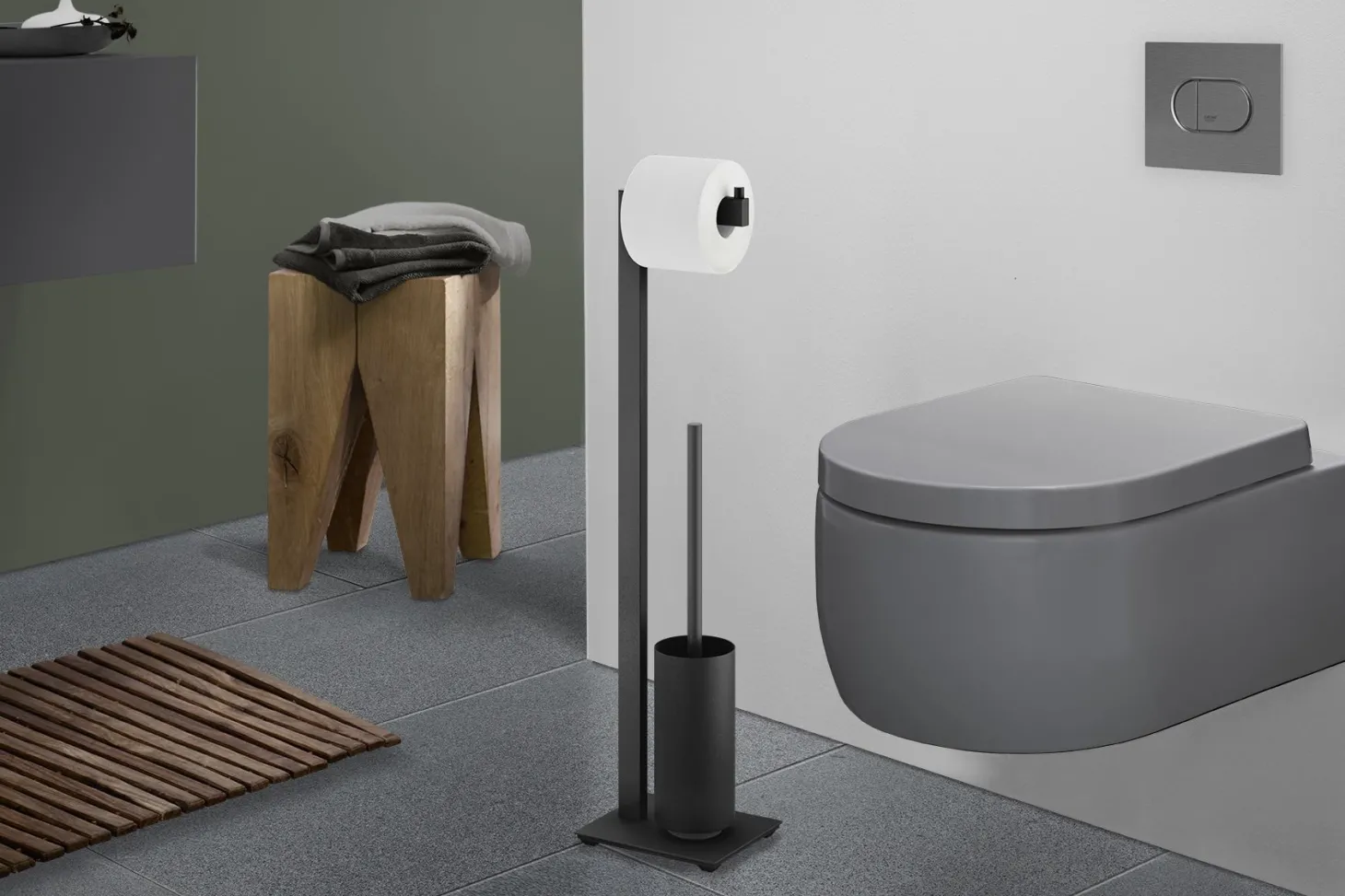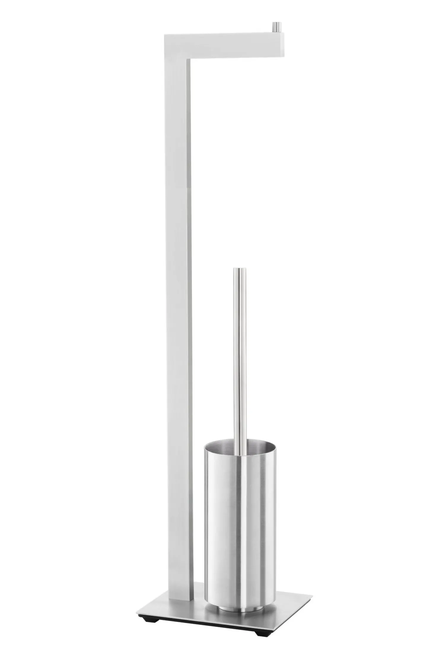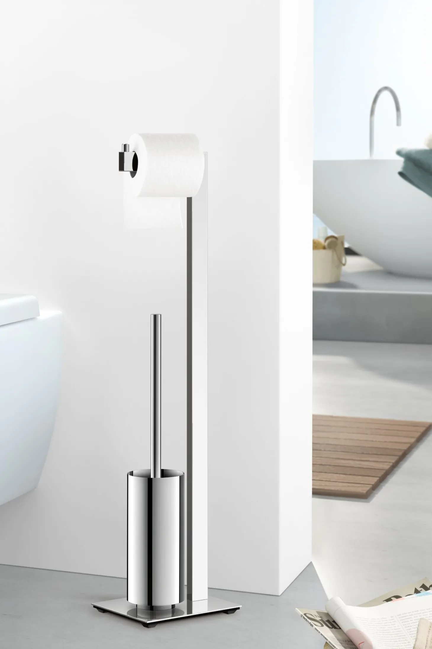 Der Toilettenbutler sorgt dafür, dass alles Wichtige stets griffbereit ist. Der integrierte Toilettenrollenhalter verfügt über einen seitlichen Stopper aus Edelstahl, der ein Abrutschen der Papierrolle verhindert und Rollen bis zu einer Breite von 115 mm aufnimmt. Die praktische Toilettenbürste ist mit einem langen Griff und einem auswechselbaren Bürstenkopf ausgestattet. Der extra hohe Behälter bietet Sichtschutz, während ein herausnehmbarer Innenbecher aus Kunststoff die Reinigung erleichtert.