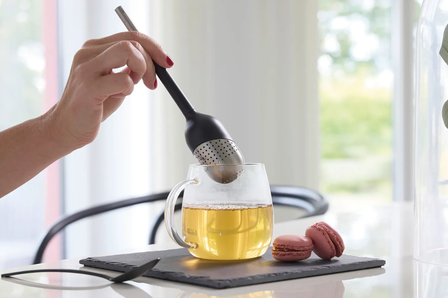 Der Stab lässt sich durch leichten Fingerdruck öffnen und schließen, und die Einrastfunktion sorgt dafür, dass er beim Befüllen sicher und stabil bleibt. Das großzügige Quellvolumen des Teeballs ist ideal für alle Arten von losen Teeblättern – von Schwarztee über Grüntee bis hin zu Kräuter- und Früchteteemischungen – und bietet den Teeblättern genügend Platz, um ihr volles Aroma abzugeben.
